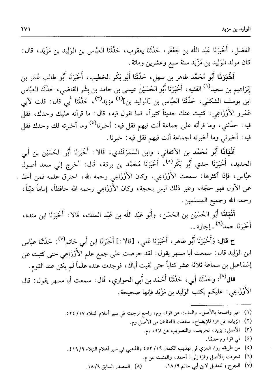 الفضل أخبرنا عبد الله بن جعفر حدثنا يعقوب حدثنا العباس بن الوليد بن مزيد قال كان مولد الوليد بن مزيد سنة سبع وعشرين ومائة أخبرنا أبو محمد طاهر بن سهل حدثنا أبو بكر الخطيب أخبرنا أبو طالب عمر بن إبراهيم بن سعيد (1) الفقيه أخبرنا أبو الحسين عيسى بن حامد بن بشر القاضي حدثنا العباس ابن يوسف الشكلي حدثنا العباس بن الوليد بن (2) مزيد (3) حدثنا أبي قال قلت لأبي عمرو الأوزاعي كتبت عنك حديثا كثيرا فما تقول فيه قال ما قرأته عليك وحدك فقل فيه حدثني وما قرأته على جماعة أنت فيهم فقل فيه أخبرنا (4) وما أخبرته لك وحدك فقل فيه أخبرني وما أخبرته لجماعة أنت فيهم فقل فيه خبرنا أنبأنا أبو محمد بن الأكفاني وابن السمرقندي قالا أخبرنا أبو الحسين بن أبي الحديد أخبرنا جدي أبو بكر (5) أخبرنا محمد بن بركة قال أخرج إلي سعد أصول عباس فإذا أكثرها سمعت الأوزاعي وكان الأوزاعي رحمه الله احترق علمه فمن أخذ عن الأول فهو حجة وغير ذلك ليس بحجة وكان الأوزاعي رحمه الله حافظا إماما دينا رحمه الله وجميع المسلمين أنبأنا أبو الحسين بن الحسن وأبو عبد الله بن عبد الملك قالا أخبرنا ابن منده أخبرنا حمد (6) إجازة قال وأخبرنا أبو طاهر أخبرنا علي قالا أخبرنا ابن أبي حاتم (7) حدثنا عباس ابن الوليد قال سمعت أبا مسهر يقول لقد حرصت على جمع علم الأوزاعي حتى كتبت عن إسماعيل بن سماعة ثلاثة عشر كتابا حتى لقيت أباك فوجدت عنده علما لم يكن عند القوم قال (8) وحدثنا أبي حدثنا أحمد بن أبي الحواري قال سمعت أبا مسهر يقول قال الأوزاعي عليكم بكتب الوليد بن مزيد فإنها صحيحة