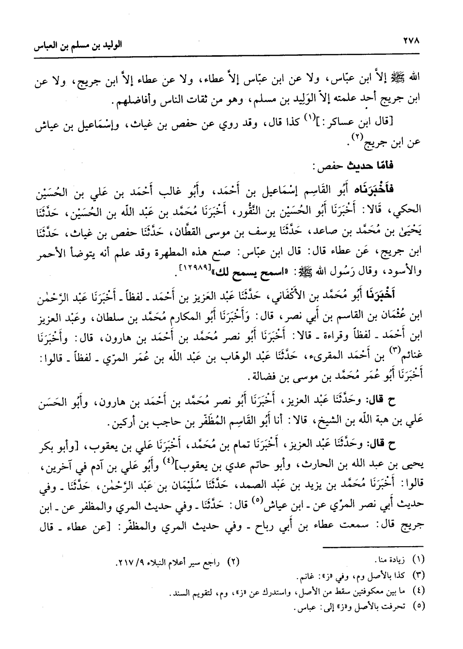 الله (صلى الله عليه وسلم) إلا ابن عباس ولا عن ابن عباس إلا عطاء ولا عن عطاء إلا ابن جريح ولا عن ابن جريح أحد علمته إلا الوليد بن مسلم وهو من ثقات الناس وأفاضلهم قال ابن عساكر (1) كذا قال وقد روي عن حفص بن غياث وإسماعيل بن عياش عن ابن جريح (2) فأما حديث حفص فأخبرناه أبو القاسم إسماعيل بن أحمد وأبو غالب أحمد بن علي بن الحسين الحكي قالا أخبرنا أبو الحسين بن النقور أخبرنا محمد بن عبد الله بن الحسين حدثنا يحيى بن محمد بن صاعد حدثنا يوسف بن موسى القطان حدثنا حفص بن غياث حدثنا ابن جريح عن عطاء قال قال ابن عباس صنع هذه المطهرة وقد علم أنه يتوضأ الأحمر والأسود وقال رسول الله (صلى الله عليه وسلم) اسمح يسمح لك أخبرنا أبو محمد بن الأكفاني حدثنا عبد العزيز بن أحمد لفظا أخبرنا عبد الرحمن ابن عثمان بن القاسم بن أبي نصر قال وأخبرنا أبو المكارم محمد بن سلطان وعبد العزيز ابن أحمد لفظا وقراءة قالا أخبرنا أبو نصر محمد بن أحمد بن هارون قال وأخبرنا غنائم (3) بن أحمد المقرئ حدثنا عبد الوهاب بن عبد الله بن عمر المري لفظا قالوا أخبرنا أبو عمر محمد بن موسى بن فضالة قال وحدثنا عبد العزيز أخبرنا أبو نصر محمد بن أحمد بن هارون وأبو الحسن علي بن هبة الله بن الشيخ قالا أنا أبو القاسم المظفر بن حاجب بن أركين قال وحدثنا عبد العزيز أخبرنا تمام بن محمد أخبرنا علي بن يعقوب وأبو بكر يحيى بن عبد الله بن الحارث وأبو حاتم عدي بن يعقوب (4) وابو علي بن آدم في آخرين قالوا أخبرنا محمد بن يزيد بن عبد الصمد حدثنا سليمان بن عبد الرحمن حدثنا وفي حديث أبي نصر المري عن ابن عياش (5) قال حدثنا وفي حديث المري والمظفر عن ابن جريح قال سمعت عطاء بن أبي رباح وفي حديث المري والمظفر عن عطاء قال