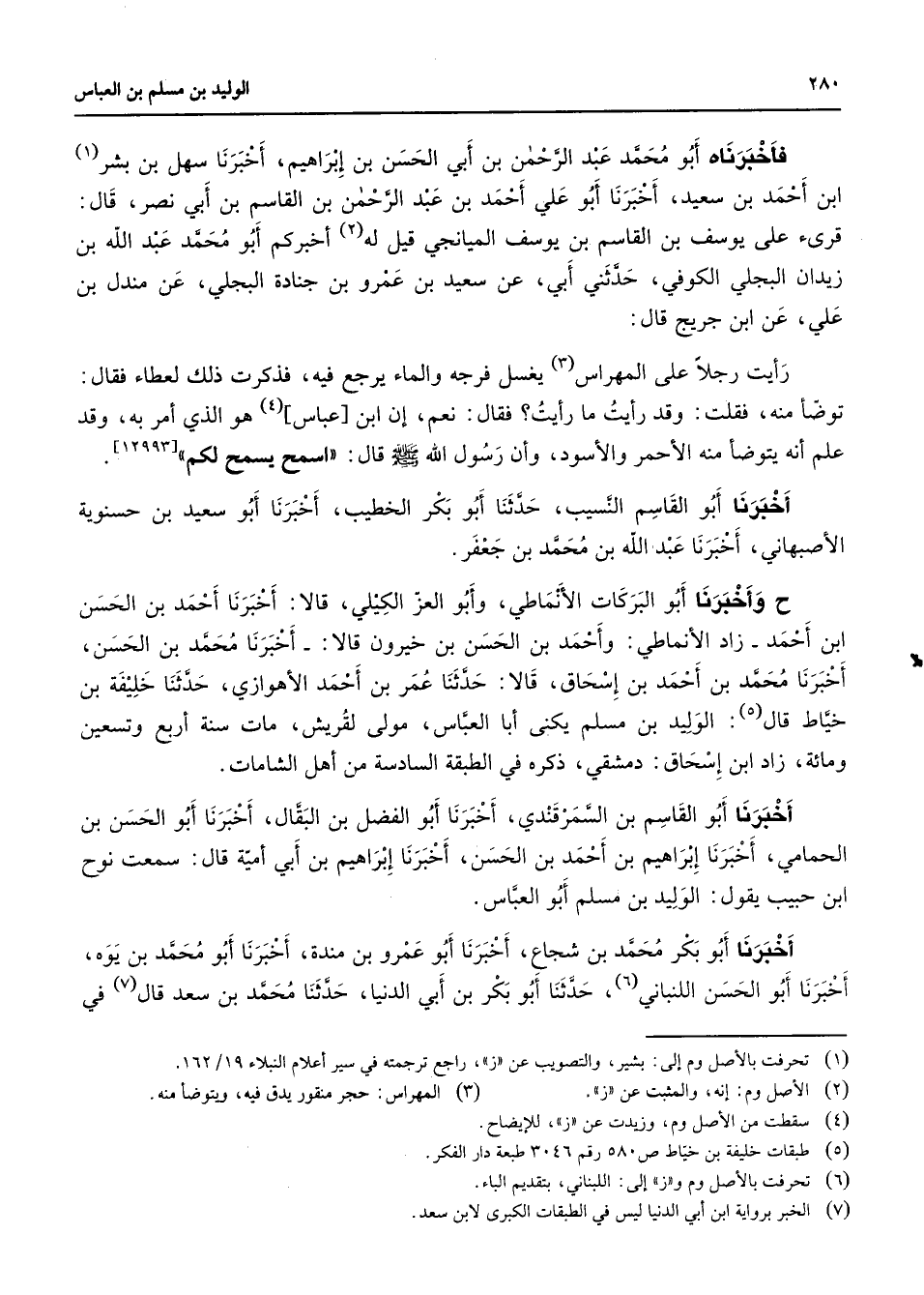 فأخبرناه أبو محمد عبد الرحمن بن أبي الحسن بن إبراهيم أخبرنا سهل بن بشر (1) ابن أحمد بن سعيد أخبرنا أبو علي أحمد بن عبد الرحمن بن القاسم بن أبي نصر قال قرئ على يوسف بن القاسم بن يوسف الميانجي قيل له (2) أخبركم أبو محمد عبد الله بن زيدان البجلي الكوفي حدثني أبي عن سعيد بن عمرو بن جنادة البجلي عن مندل بن علي عن ابن جريح قال رأيت رجلا على المهراس (3) يغسل فرجة والماء يرجع فيه فذكرت ذلك لعطاء فقال توضأ منه فقلت وقد رأيت ما رأيت فقال نعم إن ابن عباس (4) هو الذي أمر به وقد علم أنه يتوضأ منه الأحمر والأسود وأن رسول الله (صلى الله عليه وسلم) قال اسمح يسمح لكم أخبرنا أبو القاسم النسيب حدثنا أبو بكر الخطيب أخبرنا أبو سعيد بن حسنوية الأصبهاني أخبرنا عبد الله بن محمد بن جعفر ح وأخبرنا أبو البركات الأنماطي وأبو العز الكيلي قالا أخبرنا أحمد بن الحسن ابن أحمد زاد الأنماطي وأحمد بن الحسن بن خيرون قالا أخبرنا محمد بن الحسن أخبرنا محمد بن أحمد بن إسحاق قالا حدثنا عمر بن أحمد الأهوازي حدثنا خليفة بن خياط قال (5) الوليد بن مسلم يكنى أبا العباس مولى لقريش مات سنة أربع وتسعين ومائة زاد ابن إسحاق دمشقي ذكره في الطبقة السادسة من أهل الشامات أخبرنا أبو القاسم بن السمرقندي أخبرنا أبو الفضل بن البقال أخبرنا أبو الحسن بن الحمامي أخبرنا إبراهيم بن أحمد بن الحسن أخبرنا إبراهيم بن أبي أمية قال سمعت نوح ابن حبيب يقول الوليد بن مسلم أبو العباس أخبرنا أبو بكر محمد بن شجاع أخبرنا أبو عمرو بن منده أخبرنا أبو محمد بن يوه أخبرنا أبو الحسن اللنباني (6) حدثنا أبو بكر بن أبي الدنيا حدثنا محمد بن سعد قال (7) في