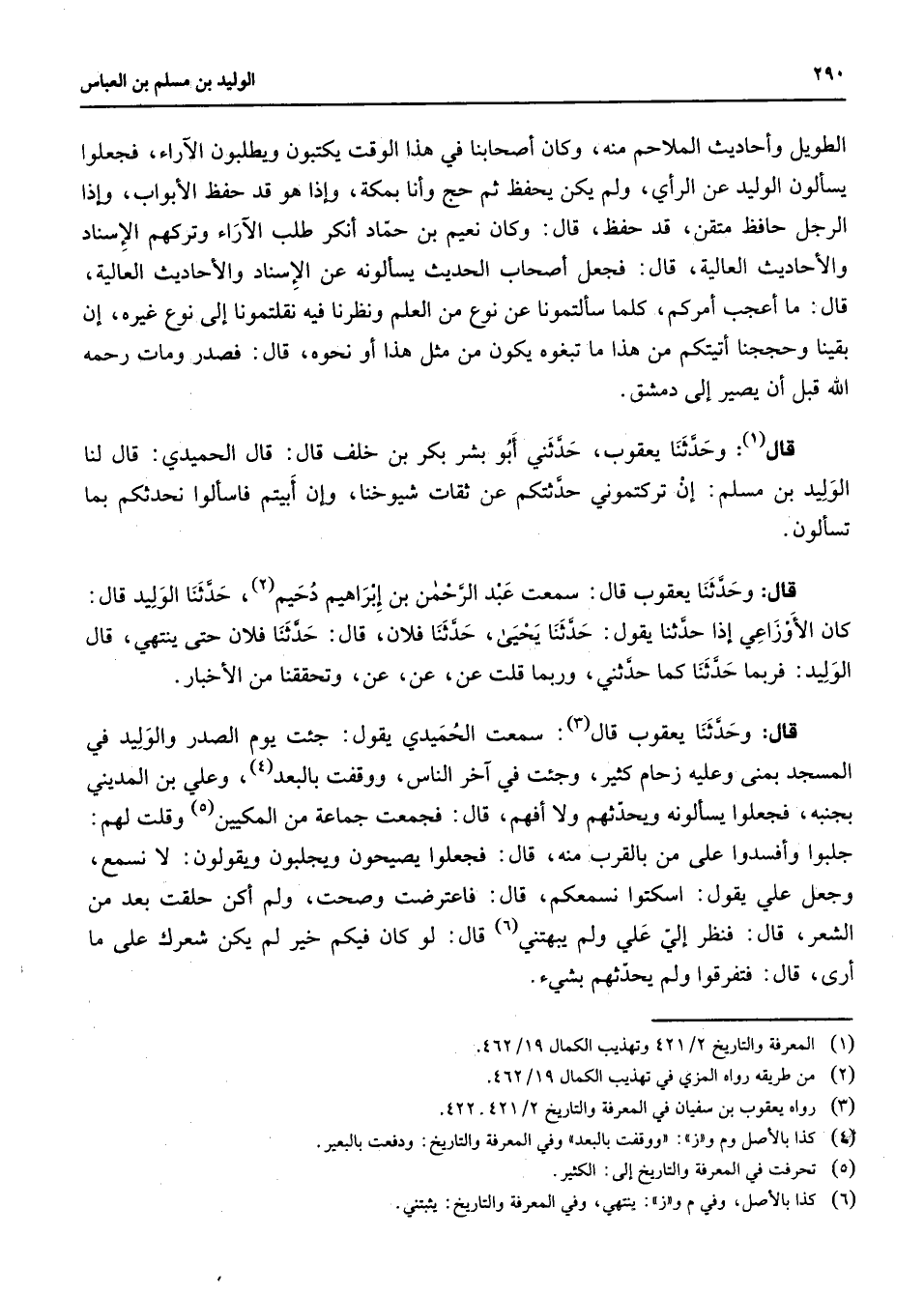 الطويل واحاديث الملاحم منه وكان أصحابنا في هذا الوقت يكتبون ويطلبون الآراء فجعلوا يسألون الوليد عن الرأي ولم يكن يحفظ ثم حج وأنا بمكة وإذا هو حفظ الأبواب وإذا الرجل حافظ متقن قد حفظ قال وكان نعيم بن حماد أنكر طلب الآراء وتركهم الإسناد والأحاديث العالية قال فجعل أصحاب الحديث يسألونه عن الإسناد والأحاديث العالية قال ما أعجب أمركم كلما سألتمونا عن نوع من العلم ونظرنا فيه نقلتمونا إلى نوع غيره إن بقينا وحججنا أتيتكم من هذا ما تبغوه يكون من مثل هذا أو نحوه قال فصدر ومات رحمه الله قبل أن يصير إلى دمشق قال (1) وحدثنا يعقوب حدثني أبو بشر بكر بن خلف قال قال الحميدي قال لنا الوليد بن مسلم إن تركتموني حدثتكم عن ثقات شيوخنا وإن أبيتم فاسألوا نحدثكم بما تسألون قال وحدثنا يعقوب قال سمعت عبد الرحمن بن إبراهيم دحيم (2) حدثنا الوليد قال كان الأوزاعي إذا حدثنا يقول حدثنا يحيى حدثنا فلان قال حدثنا فلان حتى ينتهي قال الوليد فربما حدثنا كما حدثني وربما قلت عن عن عن وتحققنا من الأخبار قال وحدثنا يعقوب قال (3) سمعت الحميدي يقول جئت يوم الصدر والوليد في المسجد بمنى وعليه زحام كثير وجئت في آخر الناس ووقفت بالبعد (4) وعلي بن المديني بجنبه فجعلوا يسألونه ويحدثهم ولا أفهم قال فجمعت جماعة من المكيين (5) وقلت لهم جلبوا وأفسدوا على من بالقرب منه قال فجعلوا يصيحون ويجلبون ويقولون لا نسمع وجعل علي يقول اسكتوا نسمعكم قال فاعترضت وصحت ولم أكن حلقت بعد من الشعر قال فنظر إلي علي ولم يبهتني (6) قال لو كان فيكم خيرا لم يكن شعرك على ما أرى قال فتفرقوا ولم يحدثهم بشئ
