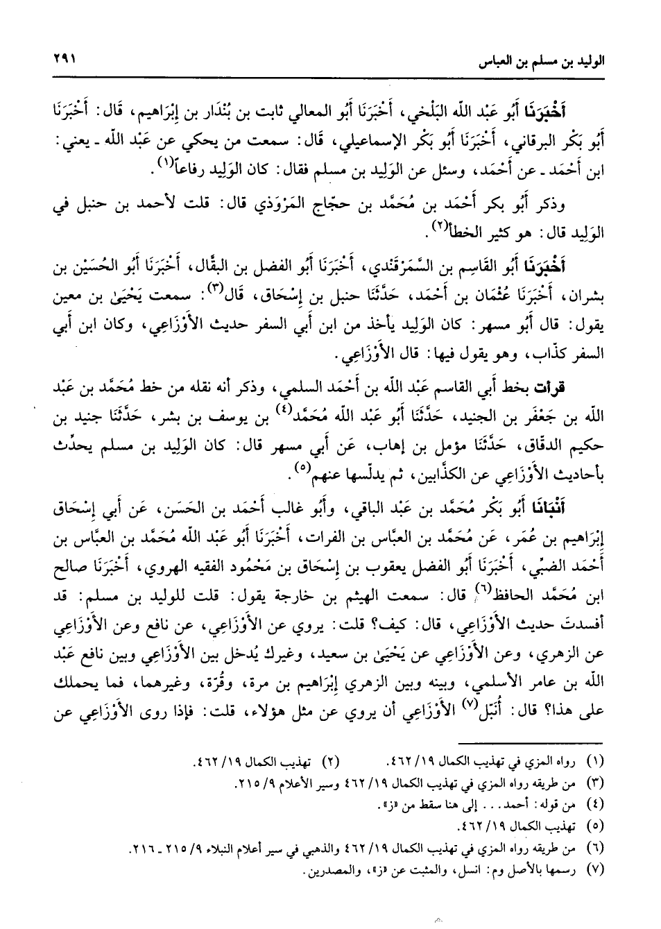 أخبرنا أبو عبد الله البلخي أخبرنا أبو المعالي ثابت بن بندار بن إبراهيم قال أخبرنا أبو بكر البرقاني أخبرنا أبو بكر الإسماعيلي قال سمعت من يحكي عن عبد الله يعني ابن أحمد عن أحمد وسئل عن الوليد بن مسلم فقال كان الوليد رفاعا (1) وذكر أبو بكر أحمد بن محمد بن حجاج المروذي قال قلت لأحمد بن حنبل في الوليد قال هو كثير الخطأ (2) أخبرنا أبو القاسم بن السمرقندي أخبرنا أبو الفضل بن البقال أخبرنا أبو الحسين بن بشران أخبرنا عثمان بن أحمد حدثنا حنبل بن إسحاق قال (3) سمعت يحيى بن معين يقول قال أبو مسهر كان الوليد يأخذ من ابن أبي السفر حديث الأوزاعي وكان ابن أبي السفر كذاب وهو يقول فيها قال الأوزاعي قرأت بخط أبي القاسم عبد الله بن أحمد السلمي وذكر أنه نقله من خط محمد بن عبد الله بن جعفر بن الجنيد حدثنا أبو عبد الله محمد (4) بن يوسف بن بشر حدثنا جنيد بن حكيم الدقاق حدثنا مؤمل بن إهاب عن أبي مسهر قال كان الوليد بن مسلم يحدث بأحاديث الأوزاعي عن الكذابين ثم يدلسها عنهم (5) أنبأنا أبو بكر محمد بن عبد الباقي وأبو غالب أحمد بن الحسن عن أبي إسحاق إبراهيم بن عمر عن محمد بن العباس بن الفرات أخبرنا أبو عبد الله محمد بن العباس ين أحمد الضبي أخبرنا أبو الفضل يعقوب بن إسحاق بن محمود الفقيه الهروي أخبرنا صالح ابن محمد الحافظ (6) قال سمعت الهيثم بن خارجة يقول قلت للوليد بن مسلم قد أفسدت حديث الأوزاعي قال: كيف؟ قلت: يروي عن الأوزاعي عن نافع وعن الأوزاعي عن الزهري وعن الأوزاعي عن يحيى بن سعيد وغيرك بدخل بين الأوزاعي وبين نافع عبد الله بن عامر الأسلمي وبينه وبين الزهري إبراهيم بن مرة وقرة وغيرهما فما يحملك على هذا قال أنبل (7) الأوزاعي أن يروي عن مثل هؤلاء قلت فإذا روى الأوزاعي عن