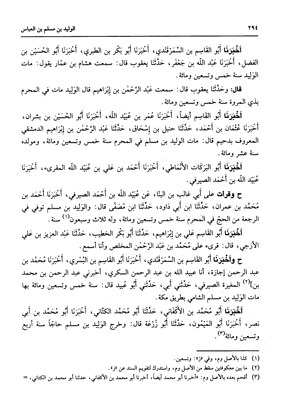 أخبرنا أبو القاسم بن السمرقندي أخبرنا أبو بكر بن الطبري أخبرنا أبو الحسين بن الفضل أخبرنا عبد الله بن جعفر حدثنا يعقوب قال سمعت هشام بن عمار يقول مات الوليد سنة خمس وتسعين ومائة قال وحدثنا يعقوب قال سمعت عبد الرحمن بن إبراهيم قال الوليد مات في المحرم بذي المروة سنة خمس وتسعين ومائة أخبرنا أبو القاسم أيضا أخبرنا عمر بن عبيد الله أخبرنا أبو الحسين بن بشران أخبرنا عثمان بن أحمد حدثنا حنبل بن إسحاق حدثنا عبد الرحمن بن إبراهيم الدمشقي المعروف بدحيم قال مات الوليد بن مسلم في المحرم سنة خمس وتسعين ومائة ومولده سنة عشر ومائة أخبرنا أبو البركات الأنماطي أخبرنا أحمد بن علي بن عبيد الله المقرئ أخبرنا عبيد الله بن أحمد الصيرفي وقرأت على أبي غالب بن البنا عن عبيد الله بن أحمد الصيرفي أخبرنا أحمد بن محمد بن عمران حدثنا ابن أبي داود حدثنا ابن مصفى قال والوليد بن مسلم توفي في الرجعة من الحج في المحرم سنة خمس وتسعين ومائة وله ثلاث وسبعون (1) سنة أخبرنا أبو القاسم علي بن إبراهيم حدثنا أبو بكر الخطيب حدثنا عبد العزيز بن علي الأزجي قال قرئ على محمد بن عبد الرحمن المخلص وأنا أسمع وأخبرنا أبو القاسم بن السمرقندي أخبرنا أبو القاسم بن اليسري أخبرنا محمد بن عبد الرحمن إجازة أنا عبيد الله بن عبد الرحمن السكري أخبرني عبد الرحمن بن محمد بن (2) المغيرة الصيرفي حدثني أبي حدثني أبو عبيد قال سنة خمس وتسعين ومائة بها مات الوليد بن مسلم الشامي بطريق مكة أخبرنا أبو محمد بن الأكفاني حدثنا أبو محمد الكتاني أخبرنا أبو محمد بن أبي نصر أخبرنا أبو الميمون حدثنا أبو زرعة قال وخرج الوليد بن مسلم حاجا سنة أربع وتسعين ومائة (3)