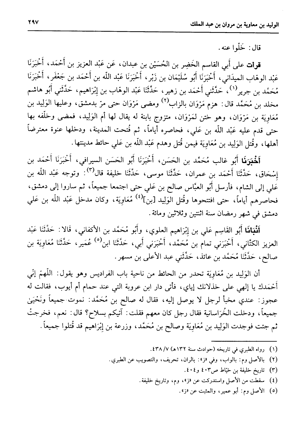 قال خلوا عنه قرأت على أبي القاسم الخضر بن الحسين بن عبدان عن عبد العزيز بن أحمد أخبرنا عبد الوهاب الميداني أخبرنا أبو سليمان بن زبر أخبرنا عبد الله بن أحمد بن جعفر أخبرنا محمد بن جرير (1) حدثني أحمد بن زهير حدثنا عبد الوهاب بن إبراهيم حدثني أبو هاشم مخلد بن محمد قال هزم مروان بالزاب (2) ومضى مروان حتى مر بدمشق وعليها الوليد بن معاوية بن مروان وهو ختن لمروان متزوج بابنه له يقال لها أم الوليد فمضى وخلفه بها حتى قدم عليه عبد الله بن علي فحاصره أياما ثم فتحت المدينة ودخلها عنوة معترضا أهلها وقتل الوليد بن معاوية فيمن قتل وهدم عبد الله بن علي حائط مدينتها أخبرنا أبو غالب محمد بن الحسن أخبرنا أبو الحسن السيرافي أخبرنا أحمد بن إسحاق حدثنا أحمد بن عمران حدثنا موسى حدثنا خليفة قال (3) وتوجه عبد الله بن علي إلى الشام فأرسل أبو العباس صالح بن علي حتى اجتمعا جميعا ثم ساروا إلى دمشق فحاصرهم أياما حتى افتتحوها وقتل الوليد بن (4) معاوية وكان مدخل عبد الله بن علي دمشق في شهر رمضان سنة اثنتين وثلاثين ومائة أنبأنا أبو القاسم علي بن إبراهيم العلوي وأبو محمد بن الأكفاني قالا حدثنا عبد العزيز الكتاني أخبرني تمام بن محمد أخبرني أبي حدثنا ابن (5) عمير حدثنا معاوية بن صالح حدثنا محمد بن عائذ حدثني عبد الأعلى بن مسهر أن الوليد بن معاوية تحدر من الحائط من ناحية باب الفراديس وهو يقول اللهم إني أحمدك يا إلهي على خذلانك إياي فأتى دار ابن عروبة التي عند حمام أم أيوب فقالت له عجوز عندي مخبأ لرجل لا يوصل إليه فقال له صالح بن محمد نمو ت جميعا ونحيى جميعا ودخلت الخراسانية فقال رجل كان معهم فقلت آتيكم بسلاح قال نعم فخرجت ثم جئت فوجدت الوليد بن معاوية وصالح بن محمد وزرعة بن إبراهيم قد قتلوا جميعا