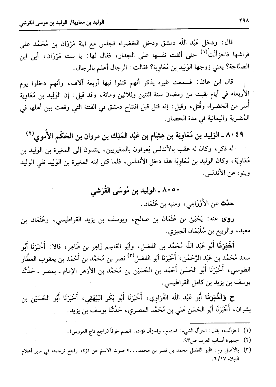 8050 - الوليد بن موسى القرشي حدث عن الأوزاعي ومنبه بن عثمان روى عنه يحيى بن عثمان بن صالح ويوسف بن يزيد القراطيسي وعثمان بن معبد والربيع بن سليمان الجيزي أخبرنا أبو عبد الله محمد بن الفضل وأبو القاسم زاهر بن طاهر قالا أخبرنا أبو سعد محمد بن عبد الرحمن أخبرنا أبو الفضل (3) نصر بن محمد بن أحمد بن يعقوب العطار الطوسي أخبرنا أبو الحسن أحمد بن الحسين بن محمد بن الأزهر الإمام بمصر حدثنا يوسف بن يزيد بن كامل القراطيسي وأخبرنا أبو عبد الله الفراوي أخبرنا أبو بكر البيهقي أخبرنا أبو الحسين بن بشران أخبر نا أبو الحسن علي بن محمد المصري حدثنا يوسف بن يزيد