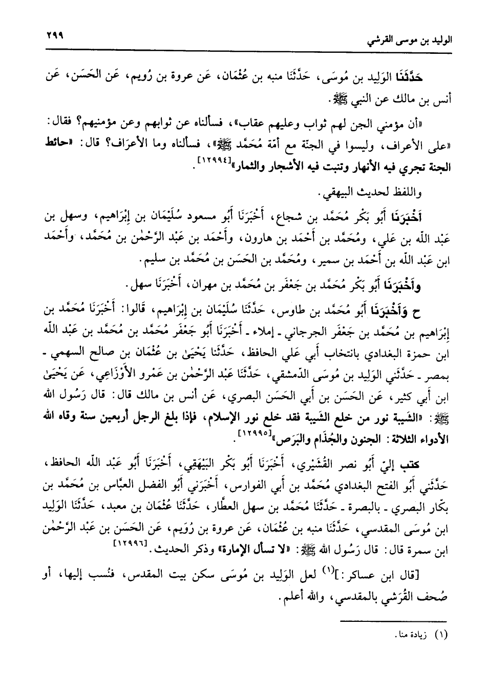 حدثنا الوليد بن موسى حدثنا منبه بن عثمان عن عروة بن رويم عن الحسن عن أنس بن مالك عن النبي (صلى الله عليه وسلم) أن مؤمني الجن لهم ثواب وعليهم عقاب فسألناه عن ثوابهم وعن مؤمنيهم فقال على الأعراف وليسوا من الجنة مع أمة محمد صلى الله عليه وسلم فسألناه وما الأعراف قال حائط الجنة تجري فيه الأنهار وتنبت فيه الأشجار والثمار واللفظ لحديث البيهقي أخبرنا أبو بكر محمد بن شجاع أخبرنا أبو مسعود سليمان بن إبراهيم وسهل بن عبد الله بن علي ومحمد بن أحمد بن هارون وأحمد بن عبد الرحمن بن محمد وأحمد ابن عبد الله بن أحمد بن سمير ومحمد بن الحسن بن محمد بن سليم وأخبرنا أبو بكر محمد بن جعفر بن محمد بن مهران أخبرنا سهل وأخبرنا أبو محمد بن طاوس حدثنا سليمان بن إبراهيم قالوا أخبرنا محمد بن إبراهيم بن محمد بن جعفر الجرجاني إملاء أخبرنا أبو جعفر محمد بن محمد بن عبد الله ابن حمزة البغدادي بانتخاب أبي علي الحافظ حدثنا يحيى بن عثمان بن صالح السهمي بمصر حدثني الوليد بن موسى الدمشقي حدثنا عبد الرحمن بن عمرو الأوزاعي عن يحيى ابن أبي كثير عن الحسن بن أبي الحسن البصري عن أنس بن مالك قال قال رسول الله (صلى الله عليه وسلم) الشيبة نور من خلع الشيبة فقد خلع نور الإسلام فإذا بلغ الرجل أربعين سنة وقاه الله الأدواء الثلاثة الجنون والجذام والبرص كتب إلي أبو نصر القشيري أخبرنا أبو بكر البيهقي أخبرنا أبو عبد الله الحافظ حدثني أبو الفتح البغدادي محمد بن أبي الفوارس أخبرني أبو الفضل العباس بن محمد بن بكار البصري بالبصرة حدثنا محمد بن سهل العطار حدثنا عثمان بن معبد حدثنا الوليد ابن موسى المقدسي حدثنا منبه بن عثمان عن عروة بن رويم عن الحسن بن عبد الرحمن ابن سمرة قال قال رسول الله (صلى الله عليه وسلم) لا تسأل الإمارة وذكر الحديث قال ابن عساكر (1) لعل الوليد بن موسى سكن بيت المقدس فنسب إليها أو صحف القرشي بالمقدسي والله أعلم