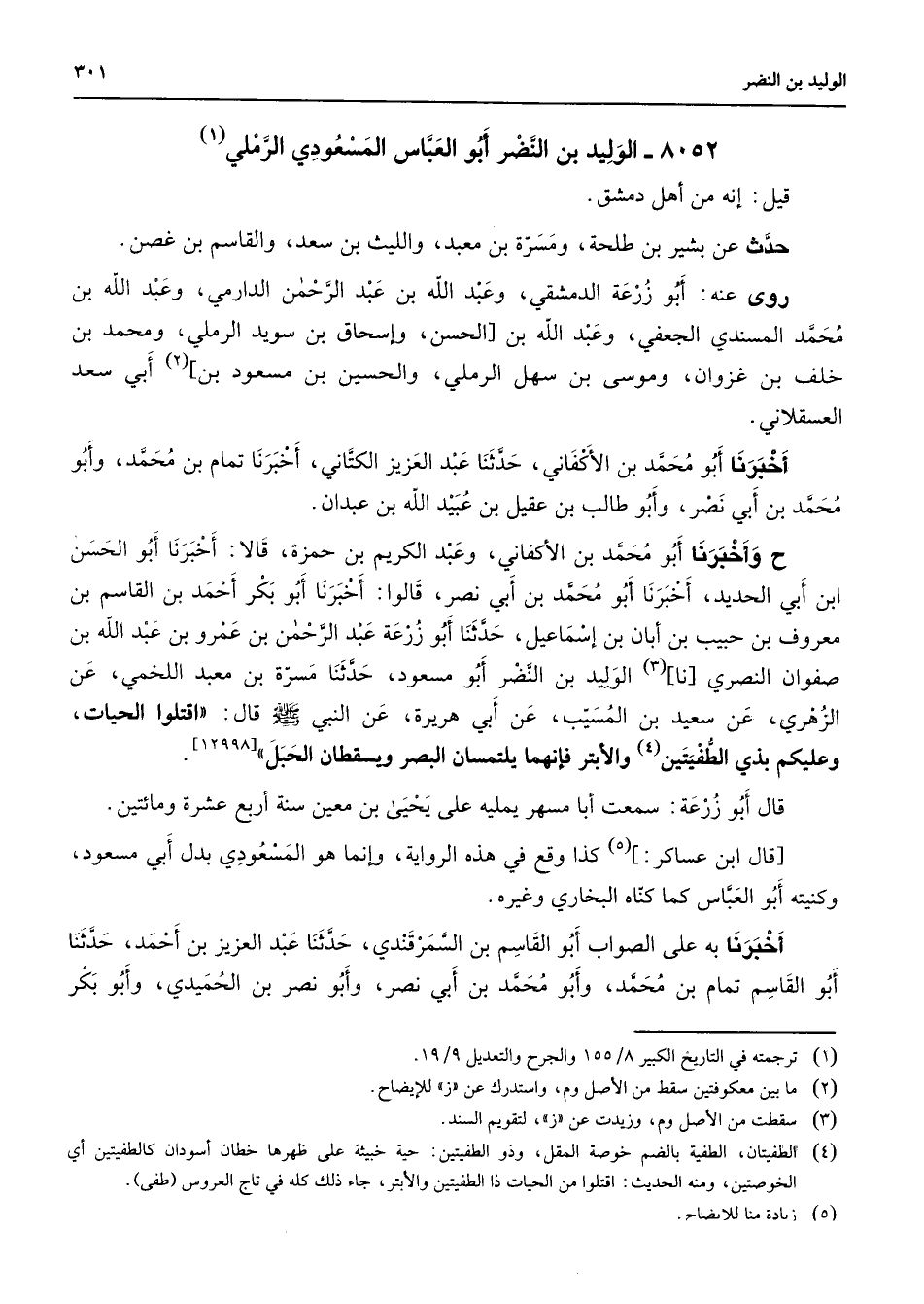 8052 - الوليد بن النضر أبو العباس المسعودي الرملي (1) قيل إنه من أهل دمشق حدث عن بشير بن طلحة ومرة بن معبد والليث بن سعد والقاسم بن غصن روى عنه أبو زرعة الدمشقي وعبد الله بن عبد الرحمن الدارمي وعبد الله بن محمد المسندي الجعفي وعبد الله بن الحسن وإسحاق بن سويد الرملي ومحمد بن خلف بن غزوان وموسى بن سهل الرملي والحسين بن مسعود بن (2) أبي سعد العسقلاني أخبرنا أبو محمد بن الأكفاني حدثنا عبد العزيز الكتاني أخبرنا تمام بن محمد وأبو محمد بن أبي نصر وأبو طالب بن عقيل بن عبيد الله بن عبدان واخبرنا أبو محمد بن الأكفاني وعبد الكريم بن حمزة قالا أخبرنا أبو الحسن ابن أبي الحديد أخبرنا أبو محمد بن أبي نصر قالوا أخبرنا أبو بكر أحمد بن القاسم بن معروف بن حبيب بن أبان بن إسماعيل حدثنا أبو زرعة عبد الرحمن بن عمرو بن عبد الله بن صفوان النصري نا (3) الوليد بن النضر أبو مسعود حدثنا مسرة بن معبد اللخمي عن الزهري عن سعيد بن المسيب عن أبي هريرة عن النبي (صلى الله عليه وسلم) قال اقتلوا الحيات وعليكم بذي الطفتيتن (4) والأبتر فإنهما يلتمسان البصر ويسقطان الحبل قال أبو زرعة سمعت أبا مسهر يمليه على يحيى بن معين سنة أربع عشرة ومائتين قال ابن عساكر (5) كذا وقع في هذه الرواية وإنما هو المسعودي يدل أبي مسعود وكنيته أبو العباس كما كناه البخاري وغيره أخبرنا به على الصواب أبو القاسم بن السمرقندي حدثنا عبد العزيز بن أحمد حدثنا أبو القاسم تمام بن محمد وأبو محمد بن أبي نصر وأبو نصر بن الحميدي وأبو بكر