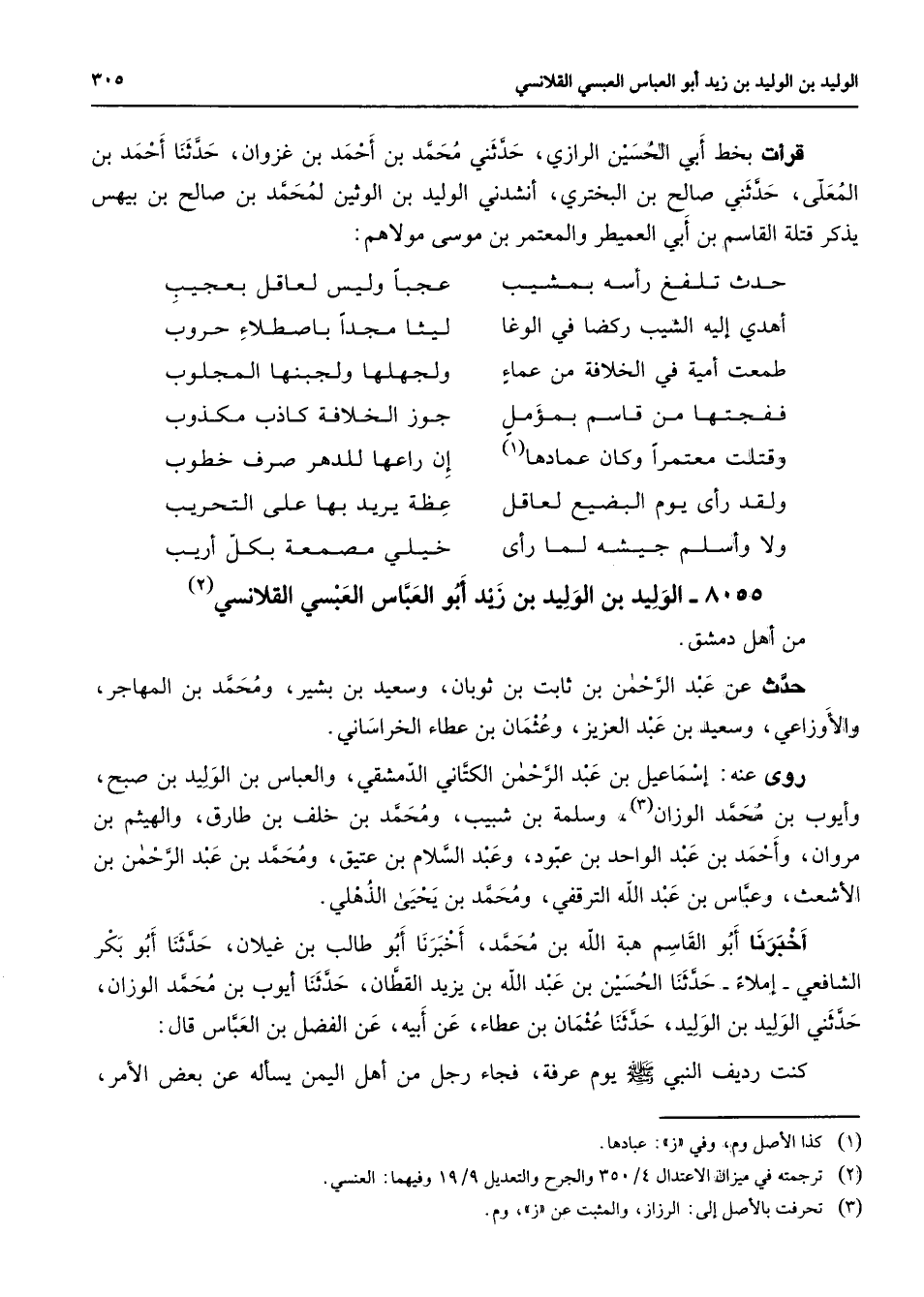 8055 - الوليد بن الوليد بن زيد أبو العباس العبسي القلانسي (2) من أهل دمشق حدث عن عبد الرحمن بن ثابت بن ثوبان وسعيد بن بشير ومحمد بن المهاجر والأوزاعي وسعيد بن عبد العزيز وعثمان بن عطاء الخراساني روى عنه إسماعيل بن عبد الرحمن الكتاني الدمشقي والعباس بن الوليد بن صبح وأيوب بن محمد الوزان (3) وسلمة بن شبيب ومحمد بن خلف بن طارق والهيثم بن مروان وأحمد بن عبد الواحد بن عبود وعبد السلام بن عتيق ومحمد بن عبد الرحمن بن الأشعت وعباس بن عبد الله الترقفي ومحمد بن يحيى الذهلي أخبرنا أبو القاسم هبة الله بن محمد أخبرنا أبو طالب بن غيلان حدثنا أبو بكر الشافعي إملاء حدثنا الحسين بن عبد الله بن يزيد القطان حدثنا أيوب بن محمد الوزان حدثني الوليد بن الوليد حدثنا عثمان بن عطاء عن أبيه عن الفضل بن العباس قال كنت رديف النبي (صلى الله عليه وسلم) يوم عرفة فجاء رجل من أهل اليمن يسأله عن بعض الأمر