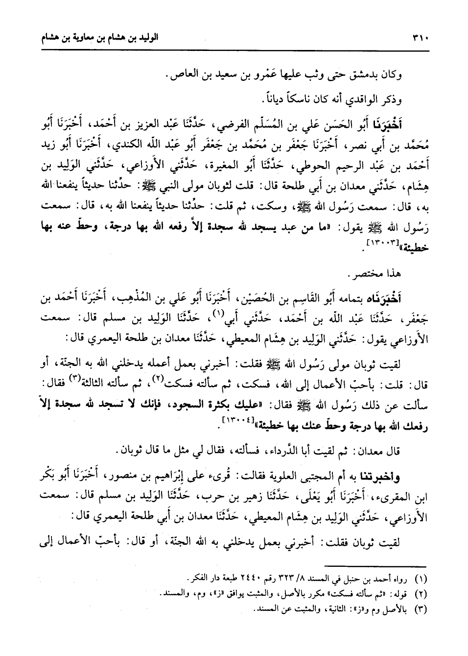 وكان بدمشق جتى وثب عليها عمرو بن سعيد بن العاص وذكر الواقدي أنه كان ناسكا ديانا أخبرنا أبو الحسن علي بن المسلم الفرضي حدثنا عبد العزيز بن أحمد أخبرنا أبو محمد بن أبي نصر أخبرنا جعفر بن محمد بن جعفر أبو عبد الله الكندي أخبرنا أبو زيد أحمد بن عبد الرحيم الحوطي حدثنا أبو المغيرة حدثني الأوزاعي حدثني الوليد بن هشام حدثني معدان بن أبي طلحة قال قلت لثوبان مولى النبي (صلى الله عليه وسلم) حدثنا حديثا ينفعنا الله به قال سمعت رسول الله (صلى الله عليه وسلم) وسكت ثم قلت حدثنا حديثا ينفعنا الله به قال سمعت رسول الله (صلى الله عليه وسلم) يقول ما من عبد يسجد لله سجدة إلا رفعه الله بها درجة وحط عنه بها خطيئة هذا مختصر أخبرناه بتمامة أبو القاسم بن الحصين أخبرنا أبو علي بن المذهب أخبرنا أحمد بن جعفر حدثنا عبد الله بن أحمد حدثني أبي (1) حدثنا الوليد بن مسلم قال سمعت الأوزاعي يقول حدثني الوليد بن هشام المعيطي حدثنا معدان بن طلحة اليعمري قال لقيت ثوبان مولى رسول الله (صلى الله عليه وسلم) فقلت أخبرني بعمل أعمله يدخلني الله به الجنة أو قال قلت بأحب الأعمال إلى الله فسكت ثم سألته (2) فسكت ثم سألته الثالثة (3) فقال سألت عن ذلك رسول الله (صلى الله عليه وسلم) فقال عليك بكثرة السجود فإنك لا تسجد لله سجدة إلا رفعك الله بها درجة وحط عنك بها خطيئة قال معدان ثم لقيت أبا الدرداء فسألته فقال لي مثل ما قال ثوبان وأخبرتنا به أم المجتبي العلوية فقالت قرئ على إبراهيم بن منصور أخبرنا أبو بكر ابن المقرئ أخبرنا أبو يعلى حدثنا زهير بن حرب حدثنا الوليد بن مسلم قال سمعت الأوزاعي حدثني الوليد بن هشام المعيطي حدثنا معدان بن أبي طلحة اليعمري قال لقيت ثوبان فقلت أخبرني بعمل يدخلني به الله الجنة أو قال بأحب الأعمال إلى