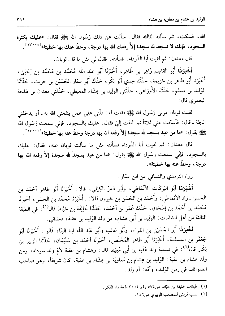 الله فسكت ثم سألته الثالثة فقال سألت عن ذلك رسول الله (صلى الله عليه وسلم) فقال عليم بكثرة السجود فإنك لا تسجد لله سجدة إلا رفعك الله بها درجة وحط عنك بها خطيئة قال معدان ثن لقيت أبا الدرداء فسألته فقال لي مثل ما قال ثوبان أخبرنا أبو القاسم زاهر بن طاهر أخبرنا أبو عبد الله محمد بن محمد بن يحيى أخبرنا أبو طاهر بن خزيمة حدثنا جدي أبو بكر حدثنا أبو عمار الحسين بن جريث حدثنا الوليد بن مسلم حدثنا الأوزاعي حدثني الوليد بن هشام المعيطي حدثني معدان بن طلحة اليعمري قال لقيت ثوبان مولى رسول الله (صلى الله عليه وسلم) فقلت له دلني على عمل ينفعني الله به أو يدخلني الجنة قال فأسكت عني ثلاثا ثم التفت إلي فقال عليك بالسجود فإني سمعت رسول الله (صلى الله عليه وسلم) يقول ما من عبد يسجد لله سجدة إلا رفعه الله بها درجة وحط عنه بها خطيئة قال معدان ثم لقيت أبا الدرداء فيألته مثل ما سألت ثوبان عنه فقال عليك بالسجود فإني سمعت رسول الله (صلى الله عليه وسلم) يقول ما من عبد يسجد لله سجدة إلا رفعه الله بها درجة وحط عنه بها خطيئة رواه الترمذي والنسائي عن ابن عمار أخبرنا أبو البركات الأنماطي وأبو العز الكيلي قالا أخبرنا أبو طاهر أحمد بن الحسن زاد الأنماطي وأحمد بن الحسن بن خيرون قالا أخبرنا محمد بن الحسن أخبرنا محمد بن أحمد بن إسحاق حدثنا عمر بن أحمد حدثنا خليفة بن خياط قال (1) في الطبقة الثالثة من أهل الشامات الوليد بن أبي هشام من ولد الوليد بن عقبة دمشقي أخبرنا أبو الحسين بن الفراء وأبو غالب وأبو عبد الله ابنا البنا قالوا أخبرنا أبو جعفر بن المسلمة أخبرنا أبو طاهر المخلص أخبرنا أحمد بن سليمان حدثنا الزبير بن بكار قال (2) في تسمية ولد عقبة بن أبي معيط قال وهشام بن عقبة لأم ولد سوداء ومن ولد هشام بن عقبة الوليد بن هشام بن معاوية بن هشام بن عقبة كان شريفا وهو صاحب الصوائف في زمن الوليد وأمه أم ولد