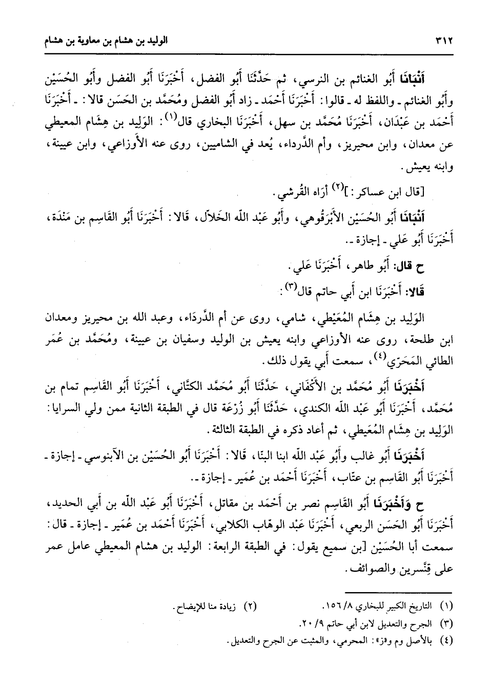 أنبأنا أبو الغنائم بن النرسي ثم حدثنا أبو الفضل أخبرنا أبو الفضل وأبو الحسين وأبو الغنائم واللفظ به له قالوا أخبرنا أحمد زاد أبو الفضل ومحمد بن الحسن قالا أخبرنا أحمد بن عبدان أخبرنا محمد بن سهل أخبرنا البخاري قال (1) الوليد بن هشام المعيطي عن معدان وابن محيريز وأم الدرداء يعد في الشاميين روى عنه الأوزاعي وابن عيينة وابنه يعيش قال ابن عساكر (2) أراه القرشي أنبأنا أبو الحسين الأبرقوهي وأبو عبد الله الخلال قالا أخبرنا أبو القاسم بن منده أخبرنا أبو علي إجازة قال أبو طاهر أخبرنا علي قالا أخبرنا ابن أبي حاتم قال (3) الوليد بن هشام المعيطي شامي روى عن أم الدرداء وعبد الله بن محيريز ومعدان ابن طلحة روى عنه الأوزاعي وابنه يعيش بن الوليد وسفيان بن عيينة ومحمد بن عمر الطائي المجري (4) سمعت أبي يقول ذلك أخبرنا أبو محمد بن الأكفاني حدثنا أبو محمد الكتاني أخبرنا أبو القاسم تمام بن محمد أخبرنا أبو عبد اللد الكندي حدثنا أبو زرعة قال في الطبقة الثانية ممن ولي السرايا الوليد بن هشام المعيطي ثم أعاد ذكره في الطبقة الثالثة أخبرنا أبو غالب وأبو عبد الله ابنا البنا قالا أخبرنا أبو الحسين بن الآبنوسي إجازة أخبرنا أبو القاسم بن عتاب أخبرنا أحمد بن عمير إجازة وأخبرنا أبو القاسم نصر بن أحمد بن مقاتل أخبرنا أبو عبد الله بن أبي الحديد أخبرنا أبو الحسن الربعي أخبرنا عبد الوهاب الكلابي أخبرنا أحمد بن عمير إجازة قال سمعت أبا الحسين بن سميع يقول في الطبقة الرابعة الوليد بن هشام المعيطي عامل عمر على قنسرين والصوائف