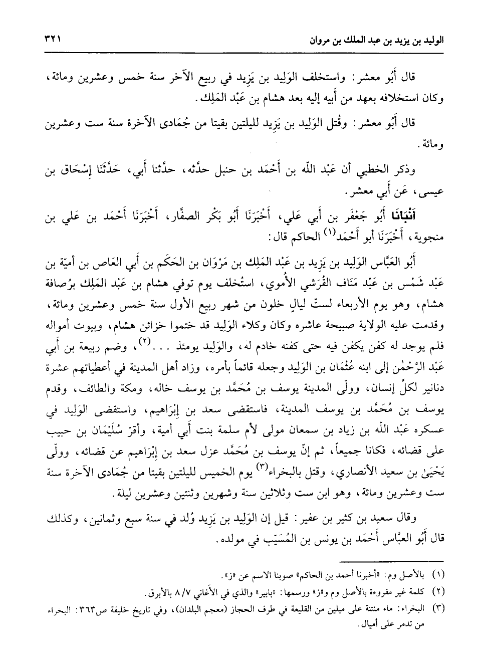 قال أبو معشر واستخلف الوليد بن يزيد في ربيع الآخر سنة خمس وعشرين ومائة وكان استخلافه بعهد من أبيه إليه بعد هشام بن عبد الملك قال أبو معشر وقتل الوليد بن يزيد لليلتين بقيتا من جمادى الآخرة سنة ست وعشرين ومائه وذكر الخطبي أن عبد الله بن أحمد بن حنبل حدثه حدثنا أبي حدثنا إسحاق بن عيسى عن أبي معشر أنبأنا أبو جعفر بن أبي علي أخبرنا أبو بكر الصفار أخبرنا أحمد بن علي بن منجوية أخبرنا أبو أحمد (1) الحاكم قال أبو العباس الوليد بن يزيد بن عبد الملك بن مروان بن الحكم بن أبي العاص بن أمية بن عبد شمس بن عبد مناف القرشي الآموي استخلف يوم توفي هشام بن عبد الملك برصافة هشام وهو يوم الأربعاء لست ليال خلون من شهر ربيع الأول سنة خمس وعشرين ومائة وقدمت عليه الولاية صبيحة عاشرة وكان وكلاء الوليد قد ختموا خزائن هشام وبيوت أمواله فلم يوجد له كفن يكفن فيه حتى كفنه خادم له والوليد يومئذ (2) وضم ربيعة بن أبي عبد الرحمن إلى ابنه عثمان بن الوليد وجعله قائما بأمره وزاد أهل المدينة في أعطياتهم عشرة دنانير لكل إنسان وولى المدينة يوسف بن محمد بن يوسف خاله ومكة والطائف وقدم يوسف بن محمد بن يوسف المدينة فاستقضى سعد بن إبراهيم واستقضى الوليد في عسكره عبد الله بن زياد بن سمعان مولى لأم سلمة بنت أبي أمية وأقر سليمان بن حبيب على قضائه فكانا جميعا ثم إن يوسف بن محمد عزل سعد بن إبراهيم عن قضائه وولى يحيى بن سعيد الآنصاري وقتل بالبخراء (3) يوم الخميس لليلتين بقيتا من جمادى الآخرة سنة ست وعشرين ومائة وهو ابن ست وثلاثين سنة وشهرين وثنتين وعشرين ليلة وقال سعيد بن كثير بن عفير قيل إن الوليد بن يزيد ولد في سنة سبع وثمانين وكذلك قال أبو العباس أحمد بن يونس بن المسيب في مولده