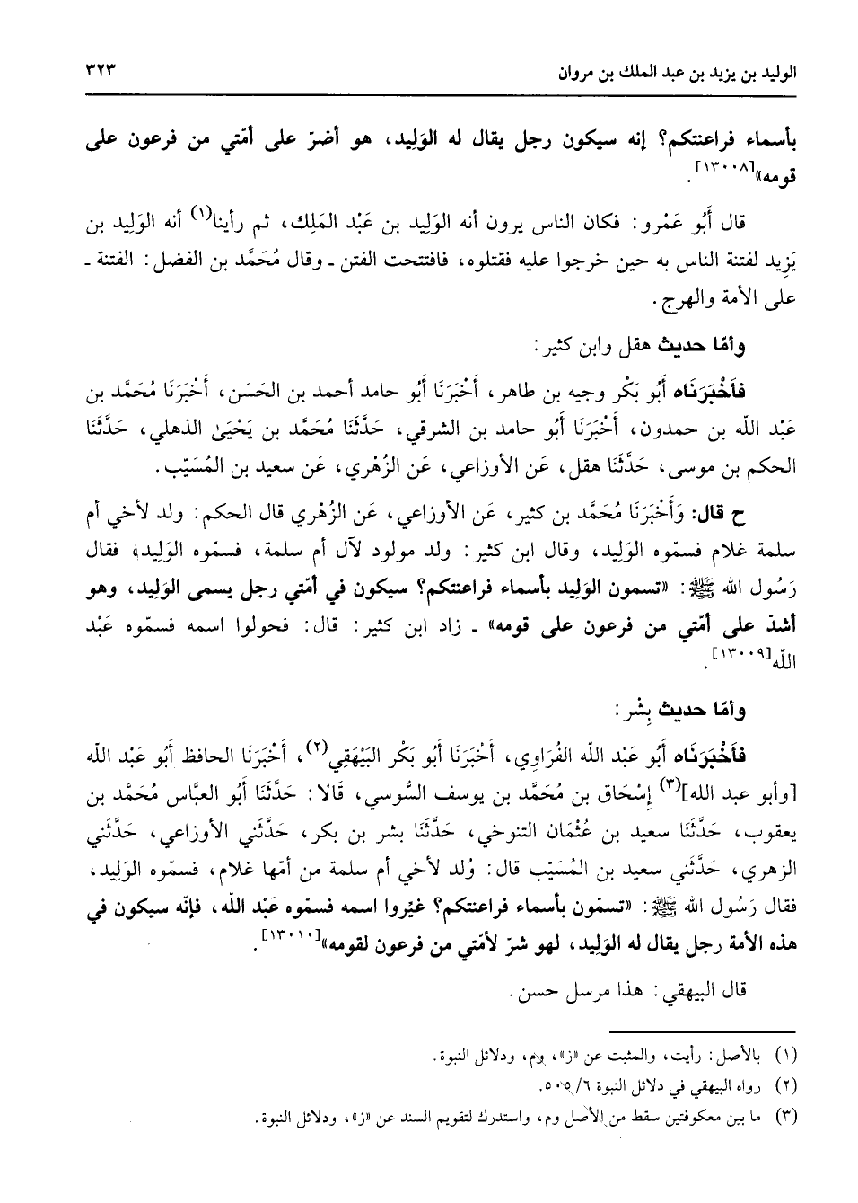 بأسماء فراعنتكم إنه سيكون رجل يقال له الوليد هو أضر على أمتي من فرعون على قومه قال أبو عمرو فكان الناس يرون أنه الوليد بن عبد الملك ثم رأينا (1) أنه الوليد بن يزيد لفتنة الناس به حين خرجوا عليه فقتلوه فافتتحت الفتن وقال محمد بن الفضل الفتنة على الأمة والهرج وأما حديث هقل وابن كثير فأخبرناه أبو بكر وجيه بن طاهر أخبرنا أبو حامد أحمد بن الحسن أخبرنا محمد بن عبد الله بن حمدون أخبرنا أبو حامد بن الشرقي حدثنا محمد بن يحيى الذهلي حدثنا الحكم بن موسى حدثنا هقل عن الأوزاعي عن الزهري عن سعيد بن المسيب قال وأخبرنا محمد بن كثير عن الأوزاعي عن الزهري قال الحكم ولد لأخي أم سلمة غلام فسموه الوليد وقال ابن كثير ولد مولود لآل أم سلمة فسموه الوليد فقال رسول الله (صلى الله عليه وسلم) تسمون الوليد بأسماء فراعنتكم سيكون في أمتي رجل يسمى الوليد وهو أشد على أمتي من فرعون على قومه زاد ابن كثير قال فحلوا اسمه فسموه عبد الله وأما حديث بشر فأخبرناه أبو عبد الله الفراوي أخبرنا أبو بكر البيهقي (2) أخبرنا الحافظ أبو عبد الله وأبو عبد الله (3) إسحاق بن محمد بن يوسف السوسي قالا حدثنا أبو العباس محمد بن يعقوب حدثنا سعيد بن عثمان التنوخي حدثنا بشر بن بكر حدثينى الأوزاغي حدثني الزهري حدثني سعيد بن المسيب قال ولد لأخي أم سلمة من أمها غلام فسموه الوليد فقال رسول الله (صلى الله عليه وسلم) تسمون بأسماء فراعنتكم غيروا اسمه فسموه عبد الله فإنه سيكون في هذه الأمة رجل يقال له الوليد لهو شر لأمتي من فرعون لقومه قال البيهقي هذا مرسل حسن