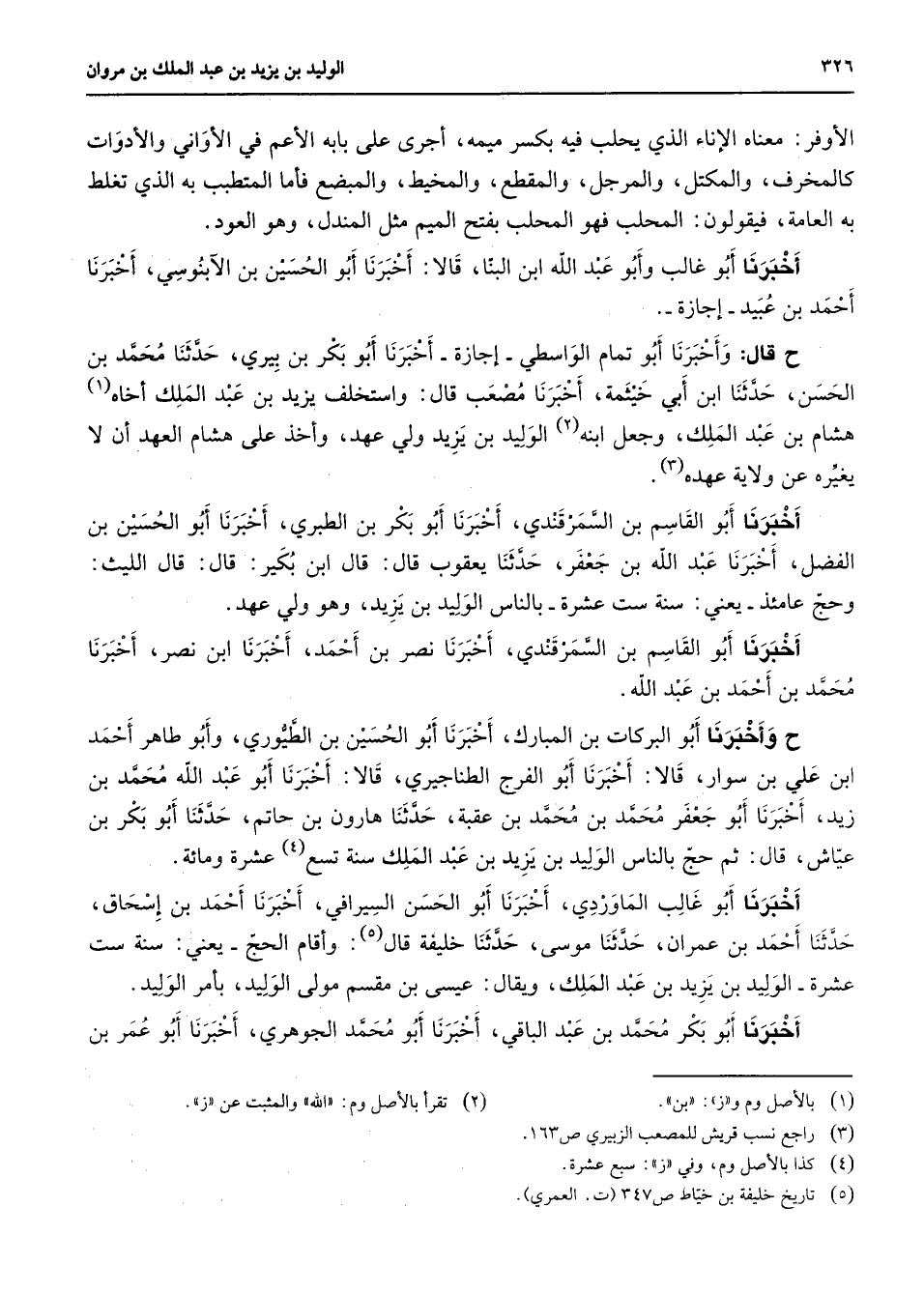 الأوفر معناه الإناء الذي يحلب فيه بكسر ميمه أجرى على بابه الأعم في الأواني والأدوات كالمخرف والمتكل والمرجل والمقطع والمخيطد والمبضع فأما المتطيب به الذي تغلظ به العامة فيقولون المحلب فهو المحلب بفتح الميم مثل المندل وهو العود أخبرنا أبو غالب وأبو عبد الله إبن البنا قالا أخبرنا أبو الحسين بن الآبنوسي أخبرنا أحمد بن عبيد إجازة ح قال وأخبرنا أبو تمام الواسطي إجازة أخبرنا أبو بكر بن بيري حدثنا محمد بن الحسن حدثنا إبن أبي خيثمة أخبرنا مصعب قال واستخلف يزيد بن عبد الملك أخاه (1) هشام بن عبد الملك وجعل ابنه (2) الوليد بن يزيد ولي عهد وأخذ على هشام العهد أن لا يغيره عن ولاية عهده (3) أخبرنا أبو القاسم بن السمرقندي أخبرنا أبو بكر بن الطبري أخبرنا أبو الحسين بن الفضل أخبرنا عبد الله بن جعفر حدثنا يعقوب قال قال ابن بكير قال قال الليث وحج عامئذ يعني سنة ست عشرة بالناس الوليد بن يزيد وهو ولي عهد أخبرنا أبو القاسم بن السمرقند ي أخبرنا نصر بن أحمد أخبرنا ابن نصر أخبرنا محمد بن أحمد بن عبد الله وأخبرنا أبو البركات بن المبارك أخبرنا أبو الحسين بن الطيوري وأبو طاهر أحمد إبن علي بن سوار قالا أخبرنا أبو الفرج الطناجيري قالا أخبرنا أبو عبد الله محمد بن زيد أخبرنا أبو جعفر محمد بن محمد بن عقبة حدثنا هارون بن حاتم حدثنا أبو بكر بن عياش قال ثم حج بالناس الوليد بن يزيد بن عبد الملك سنة تسع (4) عشرة ومائة أخرنا أبو غالب الماوردي أخبرنا أبو الحسن السيرافي أخبرنا أحمد بن إسحاق حدثنا أحمد بن عمران حدثنا موسى حدثنا خليفة قال (5) وأقام الحج يعني سنة ست عشرة الوليد بن يزيد بن عبد الملك ويقال عيسى بن مقسم مولى الوليد بأمر الوليد أخبرنا أبو بكر محمد بن عبد الباقي أخبرنا أبو محمد الجوهري أخبرنا أبو عمر بن