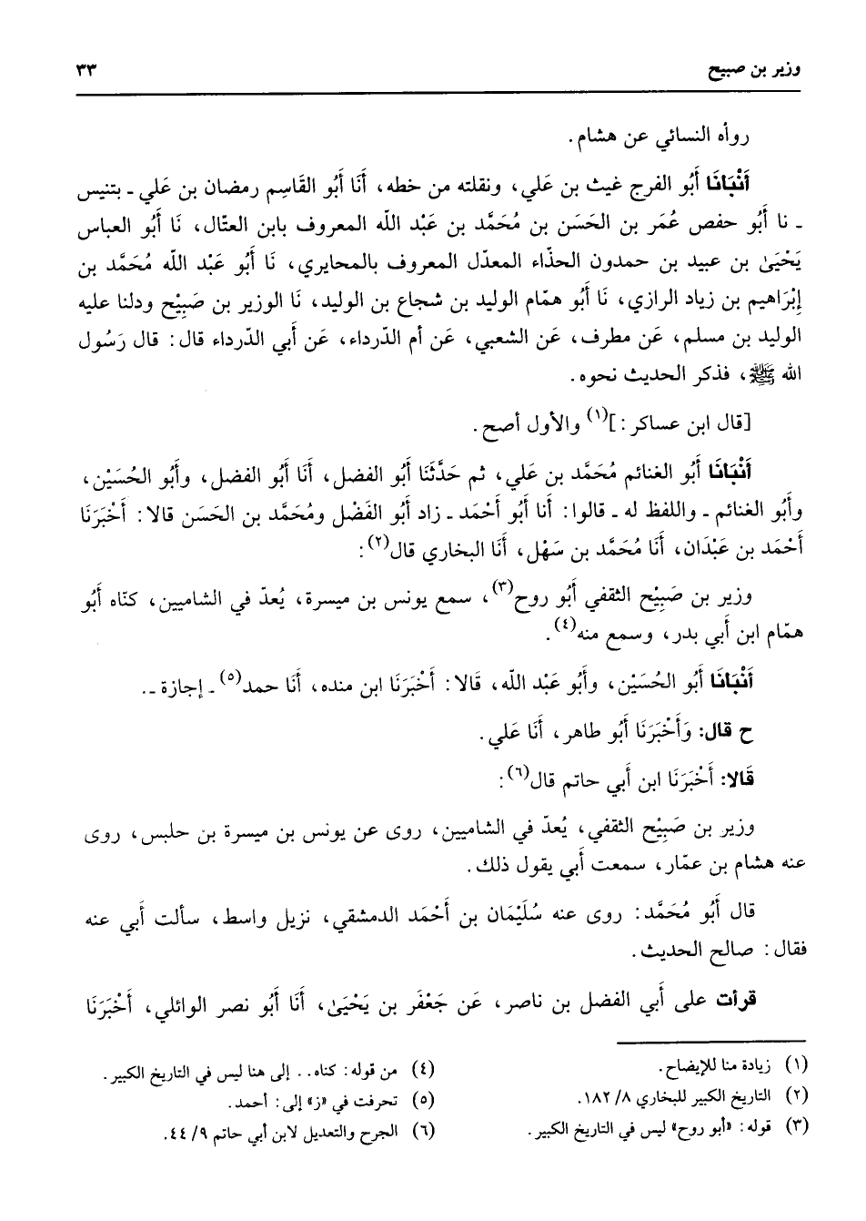 رواه النسائي عن هشام أنبأنا أبو الفرج غيث بن علي ونقلته من خطه أنا أبو القاسم رمضان بن علي بتنيس نا أبو حفص عمر بن الحسن بن محمد بن عبد الله المعروف بابن العتال نا أبو العباس يحيى بن عبيد بن حمدون الحذاء المعدل المعروف بالمحايري نا أبو عبد الله محمد بن إبراهيم بن زياد الرازي نا أبو همام الوليد بن شجاع بن الوليد نا الوزير بن صبيح ودلنا عليه الوليد بن مسلم عن مطرف عن الشعبي عن أم الدرداء عن أبي الدرداء قال قال رسول الله (صلى الله عليه وسلم) فذكر الحديث نحوه قال ابن عساكر (1) والأول أصح أنبأنا أبو الغنائم محمد بن علي ثم حدثنا أبو الفضل أنا أبو الفضل وأبو الحسين وأبو الغنائم واللفظ له قالوا أنا أبو أحمد زاد أبو الفضل ومحمد بن الحسن قالا أخبرنا أحمد بن عبدان أنا محمد بن سهل أنا البخاري قال (2) وزير بن صبيح الثقفي أبو روح (3) سمع يونس بن ميسرة يعد في الشاميين كناه أبو همام ابن أبي بدر وسمع منه (4) أنبأنا أبو الحسين وأبو عبد الله قالا أخبرنا ابن منده أنا حمد (5) إجازة ح قال وأخبرنا أبو طاهر أنا علي قالا أخبرنا ابن أبي حاتم قال (6) وزير بن صبيح الثقفي يعد في الشاميين روى عن يونس بن ميسرة بن حلبس روى عنه هشام بن عمار سمعت أبي يقول ذلك قال أبو محمد روى عنه سليمان بن أحمد الدمشقي نزيل واسط سألت أبي عنه فقال صالح الحديث قرأت على أبي الفضل بن ناصر عن جعفر بن يحيى أنا أبو نصر الوائلي أخبرنا
