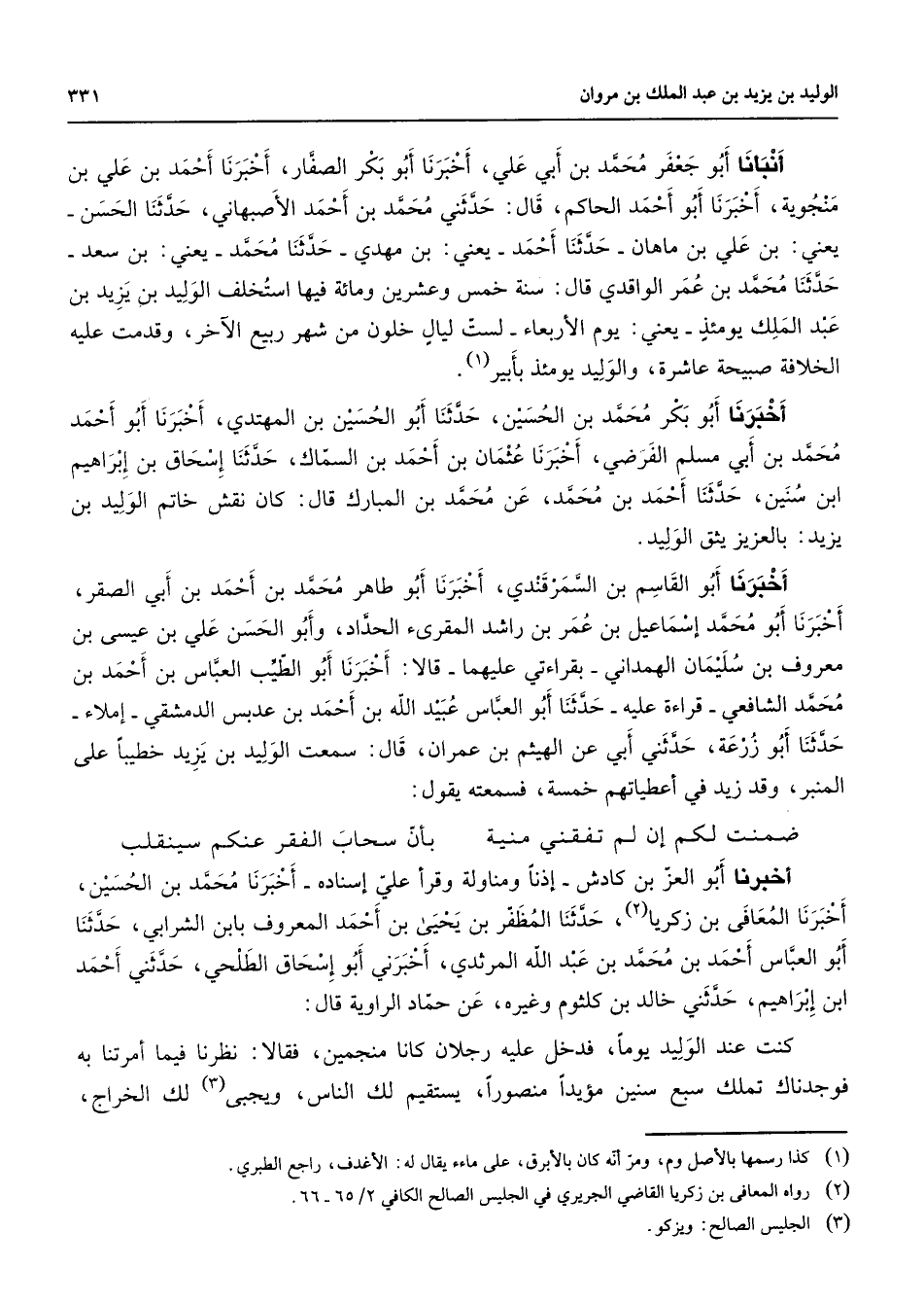 أنبأنا أبو جعفر محمد بن أبي علي أخبرنا أبو بكر الصفار أخبرنا أحمد بن علي بن منجوية أخبرنا أبو أحمد الحاكم قال حدثني محمد بن أحمد الأصبهاني حدثنا الحسن يعني بن علي بن ماهان حدثنا أحمد يعني بن مهدي حدثنا محمد يعني بن سعد حدثنا محمد بن عمر الواقدي قال سنة خمس وعشرين ومائة فيها استخلف الوليد بن يزيد بن عبد الملك يومئذ يعني يوم الأربعاء لست ليال خلون من شهر ربيع الآخر وقدمت عليه الخلافة صبيحة عاشرة والوليد يومئذ بأبير (1) أخبرنا أبو بكر محمد بن الحسين حدثنا أبو الحسين بن المهتدي أخبرنا أبو أحمد محمد بن أبي مسلم االفرضي أخبرنا عثمان بن أحمد بن السماك حدثنا إسحاق بن إبراهيم ابن سنين حدثنا أحمد بن محمد عن محمد بن المبارك قال كان نقش خاتم الوليد بن يزيد بالعزيز يثق الوليد أخبرنا أبو القاسم بن السمرقندي أخبرنا أبو طاهر محمد بن أحمد بن أبي الصقر أخبرنا أبو محمد إسماعيل بن عمر بن راشد المقرئ الحداد وأبو الحسن علي بن عيسى بن معروف بن سليمان الهمداني بقراءتي عليهما قالا أخبرنا أبو الطيب العباس بن أحمد بن محمد الشافعي قراءة عليه حدثنا أبو العباس عبيد الله بن أحمد بن عدبس الدمشقي إملاء حدثنا أبو زرعة حدثني أبي عن الهيثم بن عمران قال سمعت الوليد بن يزيد خطيبا على المنبر وقد زيد في أعطياتهم خمسة فسمعته يقول ضمنت لكم إن لم تفقني منية * بأن سحاب الفقر عنكم سينقلب * أخبرنا أبو العز بن كادش إذنا ومناولة وقرأ علي إسناده أخبرنا محمد بن الحسين أخبرنا المعافى بن زكريا (2) حدثنا المظفر بن يحيى بن احمد المعروف بإبن الشرابي حدثنا أبو العباس أحمد بن محمد بن عبد الله المرثدي أخبرنا أبو إسحاق الطلحي حدثني أحمد إبن إبراهيم حدثني خالد بن كلثوم وغيره عن حماد الراوية قال كنت عند الوليد يوما فدخل عليه رجلان كانا منجمين فقالا نظرنا فيما أمرتنا به فوجدناك تملك سبع سنين مؤيدا منصورا يستقيم لك الناس ويجبى (3) لك الخراج