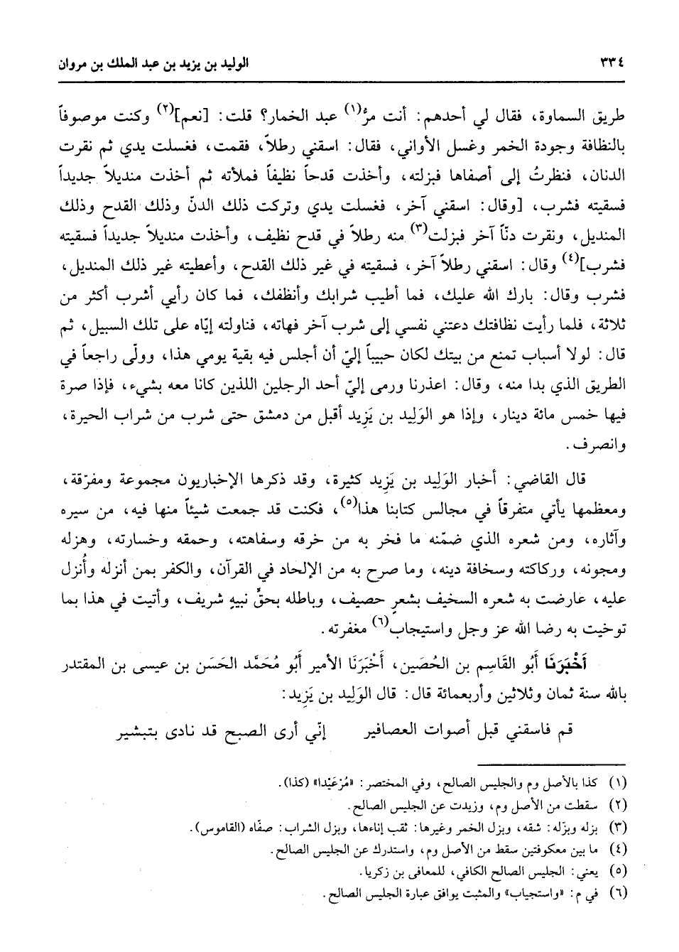 طريق السماوة فقال لي أحدهم أنت مر (1) عبد الخمار قلت نعم (2) وكنت موصوفا بالنظافة وجودة الخمر وغسل الأواني فقال اسقني رطلا فقمت فغسلت يدي ثم نقرت الدنان فنظرت إلى أصفاها فبزلته وأخذت قدحا نظيفا فملأته ثم أخذت منديلا جديدا فسقيته فشرب وقال اسقني آخر فغسلت يدي وتركت ذلك الدن وذلك القدح وذلك المنديل ونقرت دنا آخر فبزلت (3) منه رطلا في قدح نظيف وأخذت منديلا جديدا فسقيته فشرب (4) وقال اسقني رطلا آخر فسقيته في غير ذلك القدح وأعطيته غير ذلك المنديل فشرب وقال بارك الله عليك فما أطيب شرابك وأنظفك فما كان رأيي أشرب أكثر من ثلاثة فلما رأيت نظافتك دعتني نفسي إلى شرب آخر فهاته فناولته إياه على تلك السبيل ثم قال لولا أسباب تمنع من بيتك لكان حبيبا إلي أن أجلس فيه بقية يومي هذا وولى راجعا في الطريق الذي بدأ منه وقال أعذرنا ورمى إلى أحد الرجلين اللذين كانا معه بشئ فإذا صرة فيها خمس مائة دينار وإذا هو الوليد بن يزيد أقبل من دمشق حتى شرب من شراب الحيرة وانصرف قال القاضي أخبار الوليد بن يزيد كثيرة وقد ذكرها الإخباريون مجموعة ومفرقة ومعظمها يأتي متفرقا في مجالس كتابنا هذا (5) فكنت قد جمعت شيئا منها فيه من سيرة وآثاره ومن شعره الذي ضمنه ما فخر بمن خرقه وسفاهته وحمقه وخسارته وهزله ومجونه وركاكته وسخافة دينه وما صرح به من الإلحاد في القرآن والكفر بمن أنزله وأنزل عليه عارضت به شعره السخيف بشعر حصيف وباطله بحق نبيه شريف وأتيت في هذا بما توخيت به رضا الله عز وجل واستيجاب (6) مغفرته أخبرنا أبو القاسم بن الحصين أخبرنا الأمير أبو محمد الحسن بن عيسى بن المقتدر بالله سنة ثمان وثلاثين وأربعماية قال قال الوليد بن يزيد * قم فاسقني قبل أصوات العصافير إني أرى الصبح قد نادى بتبشير
