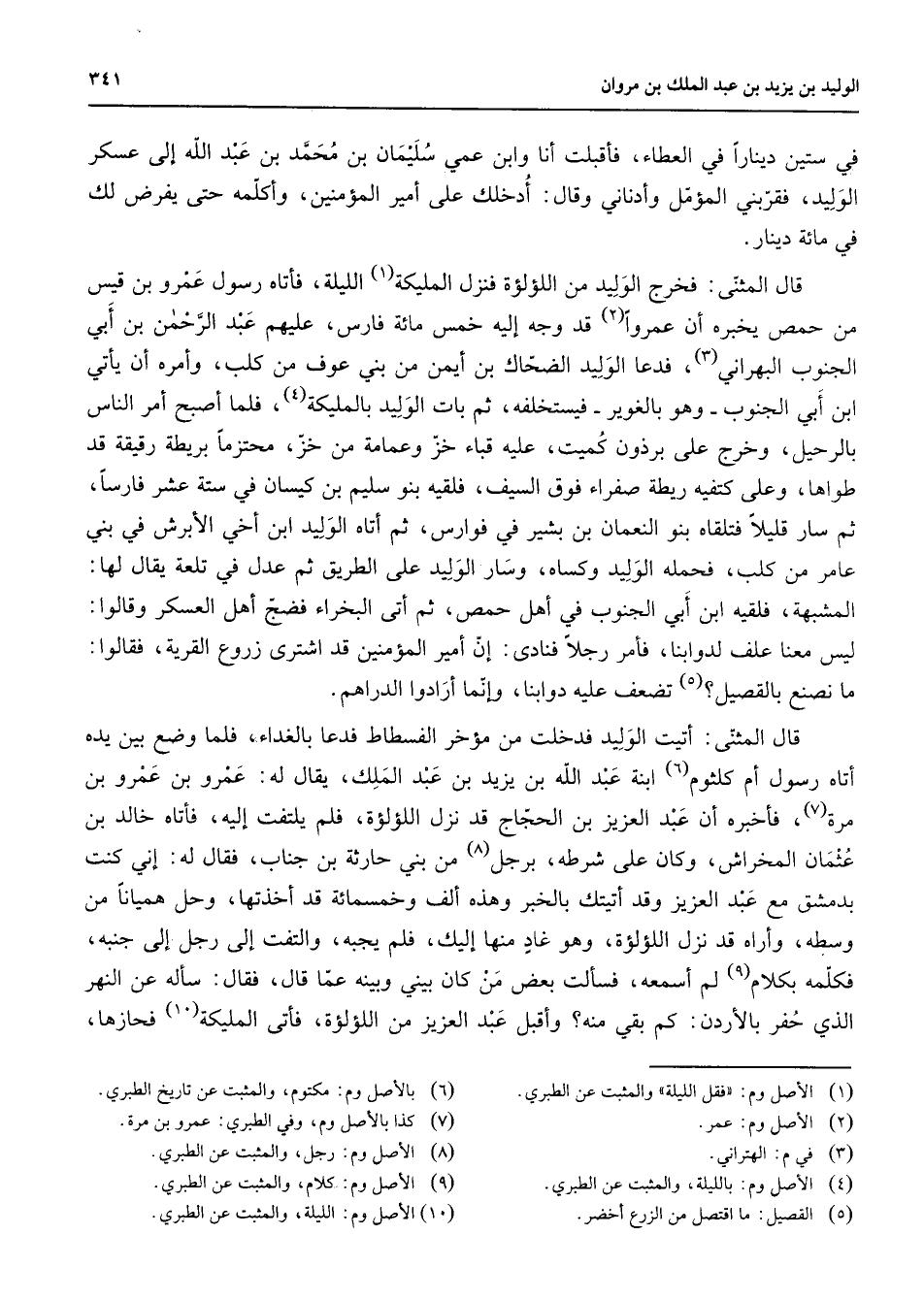 في ستين دينارا في العطاء فأقبلت أنا وابن عمي سليمان بن محمد بن عبد الله إلى عسكر الوليد فقربني المؤمل وأدناني وقال أدخلك على أمير المؤمنين وأكلمه حتى يفرض لك في مائة دينار قال المثنى فخرج الوليد من اللؤلؤة فنزل الملكية (1) اليلة فأتاه رسول عمرو بن قيس من حمص يخبره أن عمروا (2) قد وجه إليه خمس مائة فارس عليهم عبد الرحمن بن أبي الجنوب البهراني (3) فدعا الوليد الضحاك بن أيمن من بني عوف من كلب وأمره أن يأتي ابن أبي الجنوب وهو بالغوير فيستخلفه ثم بات الوليد بالملكية (4) فلما أصبح أمر الناس بالرحيل وخرج على برذون كميت عليه قباء خز وعمامة من خز محتزما بريطة رقيقة قد طواها وعلى كتفيه ربطة صفراء فوق السيف قلقيه بنو سليم بم كيسان في ستة عشر فارسا ثم سار قليل متلقاه بنو النعمان بن بشير في فوارس ثم أتاه الوليد ابن أخي الأبرش في بني عامر من كلب فحمله الوليد وكساه وسار الوليد على الطريق ثم عدل في تلعة يقال لها المشبهة فلقيه ابن أبي الجنوب في أهل حمص ثم أتى البخراء فضج أهل العسكر وقالوا ليس معنا علف لدوابنا فأمر رجلا فنادى إن أمير المؤمنين قد اشترى زروع القرية فقالوا ما نصنع بالقصيل (5) تضعف عليه دوابنا وإنما أرادوا الدراهم قال المثني أتيت الوليد فدخلت من مؤخر الفسطاط فدعا بالغداء فلما وضع بين يده أتاه رسول أم كلثوم (6) ابنة عبد الله بن يزيد بن عبد الملك يقال له عمرو بن عمرو بن مرة (7) فأخبره أن عبد العزيز بن الحجاج قد نزل اللؤلؤة فلم يلتفت إليه فأتاه خالد بن عثمان المخراش وكان على شرطه برجل (8) من بني حارثة بن جناب فقال له إني كنت بدمشق مع عبد العزيز وقد أتيتك بالخبر وهذه ألف وخمسمائة قد أخذتها وحل هيمانا من وسطه وأراه قد نزل اللؤلؤة وهو غاد منها إليك فلم يجبه والتفت إلى رجل إلى جنبه فكلمه بكلام (9) لم أسمعه فسألت بعض من كان بيني وبينه عما قال فقال سأله عن النهر الذي حفر بالأردن كم بقي منه وأقبل عبد العزيز من اللؤلؤة فأتى الملكية (10) فحازها