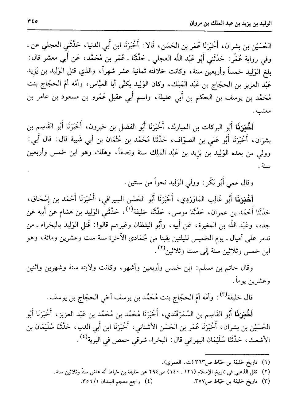 الحسين بن بشران أخبرنا عمر بن الحسن قالا أخبرنا ابن أبي الدنيا حدثني العجلي عن وفي رواية عمر حدثني أبو عبد الله العجلي حدثنا عمر بن محمد عن أبي معشر قال بلغ الوليد خمسا وأربعين سنة وكانت خلافته ثمانية عشر شهرا والذي قتل الوليد بن يزيد عبد العزيز بن الحجاج بن عبد الملك وكان الوليد يكنى أبا العباس وأمه أم الحجاج بنت محمد بن يوسف بن الحكم بن أبي عقيلة واسم أبي عقيل عمرو بن مسعود بن عامر بن معتب أخبرنا أبو البركات بن المبارك أخبرنا أبو الفضل بن خيرون أخبرنا أبو القاسم بن بشران أخبرنا أبو علي بن الصواف حدثنا محمد بن عثمان بن أبي شيبة قال قال أبي وولى من بعده الوليد بن يزيد بن عبد الملك سنة ونضفا وهلك وهو ابن خمس وأربعين سنة وقال عمي أبو بكر وولي الوليد نحوا من سنتين أخبرنا أبو غالب الماوردي أخبرنا أبو الحسن السيرافي أخبرنا أحمد بن إسحاق حدثنا أحمد بن عمران حدثنا موسى حدثنا خليفة (1) حدثني الوليد بن هشام عن أبيه عن جده وعبد الله بن المغيرة عن أبيه وأبو اليقظان وغيرهم قالوا قتل الوليد بالبخراء من تدمر على أميال يوم الخميس لليلتين بقيتا من جمادى الآخرة سنة ست وعشرين ومائة وهو ابن خمس وثلاثين سنة إلى ست وثلاثين (2) وقال حاتم بن مسلم ابن خمس وأربعين وأشهر وكانت ولايته سنة وشهرين واثنتين وعشرين يوما قال خليفة (3) وأمه أم الحجاج بنت محمد بن يوسف أخي الحجاج بن يوسف أخبرنا أبو القاسم بن السمرقندي أخبرنا محمد بن محمد بن عبد العزيز أخبرنا أبو الحسين بن بشران أخبرنا عمر بن الحسن الأشناني أخبرنا ابن أبي الدنيا حدثنا سليمان بن الأشعت حدثنا سليمان البهراني قال البخراء شرقي حمص في البرية (4)