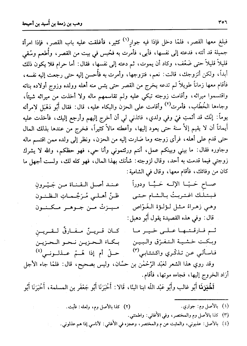 فبلغ معها القصر فلما دخل فإذا فيه جوار (1) كثير فأغلقت عليه باب القصر فإذا امرأة جميلة قد أتته فدعته إلى نفسها فأبى فأمرت به فحبس في بيت من القصر وأطعم وسقي قليلا قليلا حتى ضعف وكاد أن يموت ثم دعته إلى نفسها فال أما حرام فلا يكون ذلك أبدا ولكن أتزوجك قالت نعم فتزوجها وأمرت به فأحسن إليه حتى رجعت إليه نفسه فأقام معها زمانا طويلا لم تدعه يخرج من القصر حتى يئس منه أهله وولده وزوج أولاده بناته واقتسموا ميراثه وأقامت زوجته تبكي عليه ولم تقاسمهم ماله ولا أخذت من ميراثه شيئا وجاءها الخطاب فأمرت (2) وأقامت على الحزن والبكاء عليه قال فقال أبو دهبل لامرأته يوما إنك قد أثمت في وفي ولدي فائذني لي أن أخرج إليهم وأرجع إليك فأخذت عليه أيمانا أن لا يقيم إلا سنة حتى يعود إليها وأعطته مالا كثيرا فخرج من عندها بذلك المال حتى قدم على أهله فرأى زوجته وما صارت إليه من الحزن ونظر إلى ولده ممن اقتسم ماله وجاوروه فقال ما بيني وبينكم عمل أنتم ورثتموني وأنا حي فهو حظكم والله لا يشرك زوجتي فيما قدمت به أحد وقال لزوجته شأنك بهذا المال فهو كله لك ولست أجهل ما كان من وفائك فأقام معها وقال في الشامية * صاح حيا الإله حيا ودورا * عند أصل القناة من جيرون فبتلك اغتربت بالشام حتى * ظن أهلي مرجمات الظنون وهي زهراء مثل لؤلؤ الغواص * ميزت من جوهر مكنون قال وفي هذه القصيدة يقول أبو دهبل ثم فارقتها على خير ما * كان قرين مفارق لقرين وبكت خشيت التفرق والبين * بكاء الحزين نحو الحزين فاسألي عن تذكري واكتائبي (3) حل أم إذا هم عذلوني (4) وقد روي هذا الشعر لعبد الرحمن بن حسان وليس بصحيح قال فلما جاء الأجل أراد الخروج إليها فجاءه موتها فأقام أخبرنا أبو غالب وابو عبد الله ابنا البنا قالا أخبرنا أبو جعفر بن المسلمة أخبرنا أبو