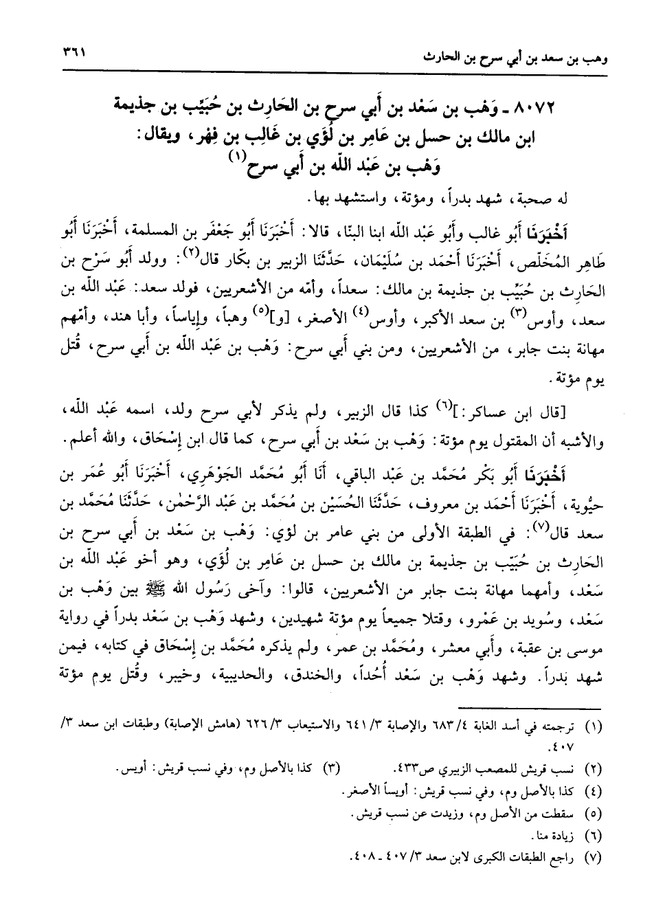 8072 - وهب بن سعد بن أبي سرح بن الحارث بن حبيب بن جذيمة ابن مالك بن حسل بن عامر بن لؤي بن غالب بن فهر ويقال وهب بن عبد الله بن أبي سرح (1) له صحبة شهد بدرا ومؤتة واستشهد بها أخبرنا أبو غالب وأبو عبد الله ابنا البنا قالا أخبرنا أبو جعفر بن المسلمة أخبرنا أبو طاهر المخلص أخبرنا أحمد بن سليمان حدثنا الزبير بن بكار قال (2) وولد أبو سرح بن الحارث بن حبيب بن جذيمة بن مالك سعدا وأمه من الأشعرين فولد سعد عبد الله بن سعد وأوس (3) بن سعد الأكبر وأوس (4) الأصغر و (5) وهبا وإياسا وابا هند وأمهم مهانة بنت جابر من الأشعريين ومن بني أبي سرح وهب بن عبد الله بن أبي سرح قتل يوم مؤتة قال ابن عساكر (6) كذا قال الزبير ولم يذكر لأبي سرح ولد اسمه عبد الله والأشبه أن المقتول يوم مؤتة وهب بن سعد بن أبي سرح كما قال ابن إسحاق والله أعلم أخبرنا أبو بكر محمد بن عبد الباقي أنا أبو محمد الجوهري أخبرنا أبو عمر بن حيوية أخبرنا أحمد بن معروف حدثنا الحسين بن محمد بن عبد الرحمن حدثنا محمد بن سعد قال (7) في الطبقة الأولى من بني عامر بن لؤي وهب بن سعد بن أبي سرح بن الحارث بن حبيب بن جذيمة بن مالك بن حسل بن عامر بن لؤي وهو أخو عبد الله بن سعد وامهما مهانة بنت جابر من الأشعريين قالوا وآخى رسول الله (صلى الله عليه وسلم) بين وهب بن سعد وسويد بن عمرو وقتلا جميعا يوم مؤتة شهيدين وشهد وهب بن سعد بدرا في رواية موسى بن عقبة وأبي معشر ومحمد بن عمر ولم يذكرة محمد بن إسحاق في كتابه فيمن شهد بدرا وشهد وهب بن سعد أحدا والخندق والحديبية وخيبر وقتل يوم مؤتة