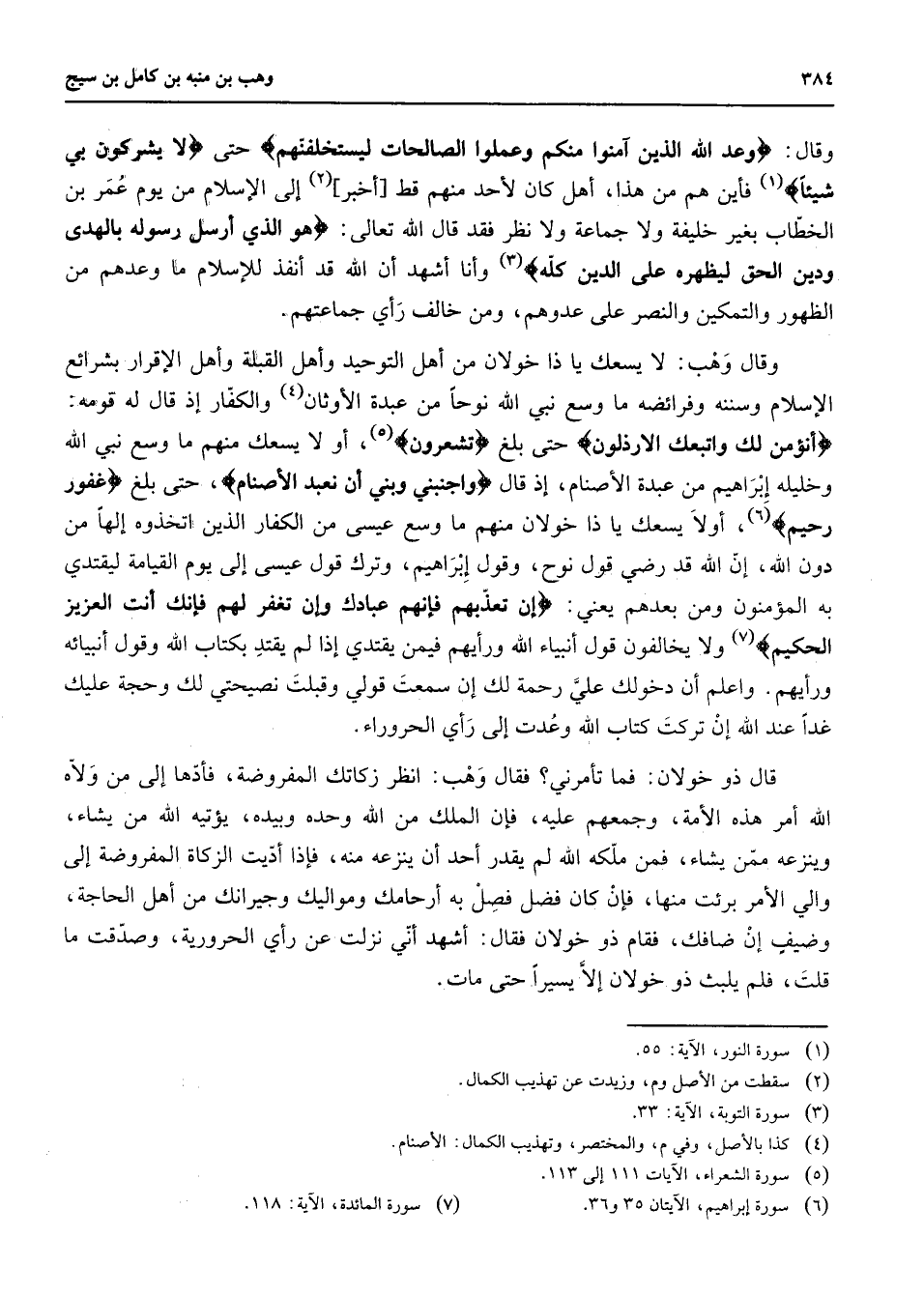 وقال " وعد الله الذين آمنوا منكم وعملوا الصالحات ليستخلفنهم " حتى " لا يشركون بي شيئا " (1) فإين هم من هذا أهل كان لأحد منهم قط أخبر (2) إلى الإسلام من يوم عمر بن الخطاب بغير خليفة ولا جماعة ولا نظر فقد قال الله تعالى " هو الذي أرسل رسوله بالهدى ودين الحق ليظهره على الدين كله " (3) وأنا أشهد أن الله قد أنفذ للإسلام ما وعدهم من الظهور والتمكين والنصر على عدوهم ومن خالف رأي جماعتهم وقال وهب لا يسعك يا ذا خولان من أهل التوحيد وأهل القبلة وأهل الإقرار بشرائع الإسلام وسننه وفرائضه وما وسع نبي الله نوحا من عبدة الأوثان (4) والكفار إذ قال له قومه " أنؤمن لك وأتبعك الأرذلون " حتى بلغ " تشعرون " (5) أو لا يسعك منهم ما وسع نبي الله وخليله إبراهيم من عبدة الأصنام إذ قال " واجنبني وبني أن نعبد الأصنام " حتى بلغ " غفور رحيم " (6) أولا يسعك يا ذا خولان منهم ما وسع عيسى من الكفار الذين اتخذوه إلها من دون الله إن الله قد رضي قول نوح وقول إبراهيم وترك قول عيسى إلى يوم القيامة ليقتدي به المؤمنون ومن بعدهم يعني " إن تعذبهم فإنهم عبادك وإن تغفر لهم فإنك أنت العزيز الحكيم " (7) ولا يخالفون قول أنبياء الله ورأيهم فيمن يقتدي إذا لم يقتد بكتاب الله وقول أنبيائه ورأيهم واعلم أن دخولك علي رحمة لك إن سمعت قولي وقبلت نصيحتي لك وحجة عليك غدا عند الله إن تركت كتاب الله وعدت إلى رأي الحر وراء قال ذو خولان فما تأمرني فقال وهب انظر زكاتك المفروضة فأدها إلى من ولاه الله أمر هذه الأمة وجمعهم عليه فإن الملك من الله وحده وبيده يؤتيه الله من يشاء وينزعه ممن يشاء فمن ملكه الله لم يقدر أحد أن ينزعه منه فإذا أديت الزكاة المفروضة إلى والي الأمر برئت منها فإن كان فضل فصل به أرحامك ومواليك وجيرانك من أهل الحاجة وضيف إن ضافك فقام ذو خولان فقال أشهد إني نزلت عن رأي الحرورية وصدقت ما قلت فلم يلبث ذو خولان إلا يسيرا حتى مات
