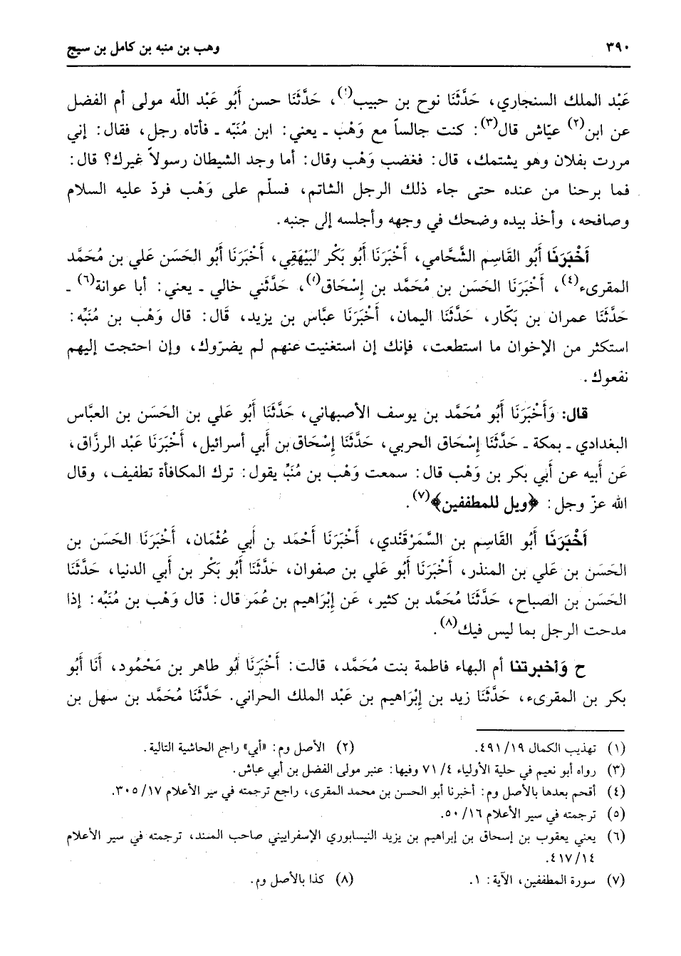 عبد الملك السنجاري حدثنا نوح بن حبيب (1) حدثنا حسن أبو عبد الله مولى أم الفضل عن أبن (2) عياش قال (3) كنت جالسا مع وهب يعني ابن منبه فأتاه رجل فقال إني مررت بفلان وهو يشتمك قال فغضب وهب قال أما وجد الشيطان رسولا غيرك قال فما برحنا من عنده حنى جاء ذلك الرجل الشاتم فسلم على وهب فرد عليه السلام وصافحه وأخذ بيده وضحك في وجهه وأجلسه إلى جنبه أخبرنا أبو القاسم الشحامي أخبرنا أبو بكر البيهقي أخبرنا أبو الحسن علي بن محمد المقرئ (4) أخبرنا الحسن بن محمد بن إسحاق (5) حدثني خالي يعني أبا عوانة (6) حدثنا عمران بن بكار حدثنا اليمان أخبرنا عباس بن يزيد قال قال وهب بن منبه استكثر من الإخوان ما استطعت فإنك إن استغنيت عنهم لم يضروك وإن احنجت إليهم نفعوك قال وأخبرنا أبو محمد بن يوسف الأصبهاني حدثنا أبو علي بن الحسن بن العباس البغدادي بمكة حدثنا إسحاق الحربي حدثنا إسحاق بن أبي أسرائيل أخبرنا عبد الرزاق عن أبيه عن أبي بكر بن وهب قال سمعت وهب بن منبه يقول ترك المكافأة تطفيف وقال الله عز وجل " ويل للمطفيفين " (7) أخبرنا أبو القاسم بن السمرقندي أخبرنا أحمد بن أبي عثمان أخبرنا الحسن بن الحسن بن علي بن المنذر أخبرنا أبو علي بن صفوان حدثنا أبو بكر بن أبي الدنيا حدثنا الحسن بن الصباح حدثنا محمد بن كثير عن إبراهيم بن عمر قال قال وهب بن منبه إذا مدحت الرجل بما ليس فيك (8) ح وأخبرتنا أم البهاء فاطمة بنت محمد قالت أخبرنا أبو طاهر بن محمود أنا أبو بكر بن المقرئ حدثنا زيد بن إبراهيم بن عبد الملك الحراني حدثنا محمد بن سهل بن