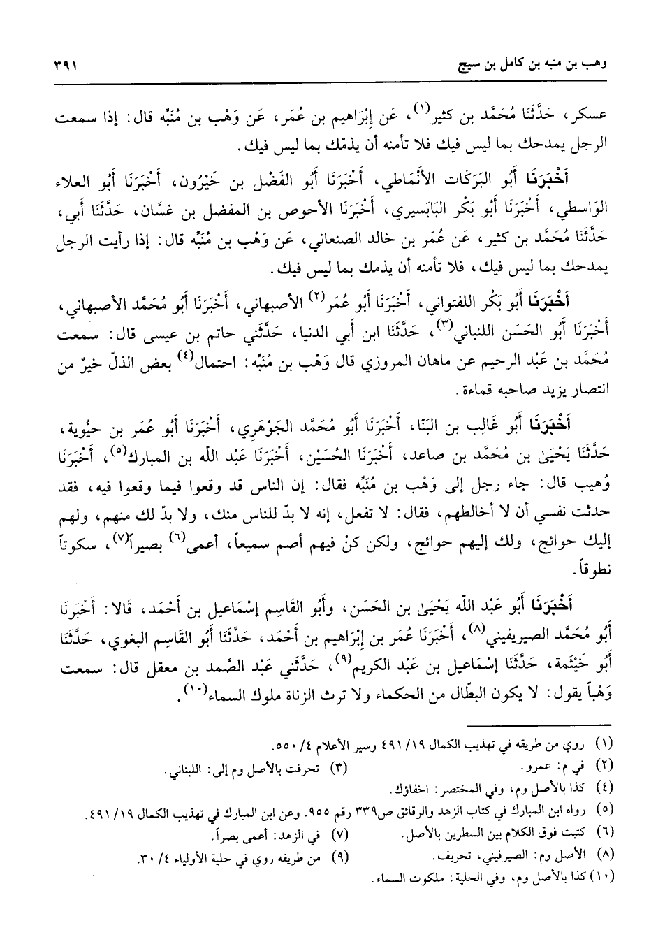 عسكر حدثنا محمد بن كثير (1) عن إبراهيم بن عمر عن وهب بن منبه قال إذا سمعت الرجل يمدحك بما ليس فيك فلا تأمنه أن يذمك بما ليس فيك أخبرنا أبو البركات الأنماطي أخبرنا أبو الفضل بن خيرون أخبرنا أبو العلاء الواسطي أخبرنا أبو بكر البابسيري أخبرنا الأحوص بن المفضل بن غسان حدثنا أبي حدثنا محمد بن كثير عن عمر بن خالد الصنعاني عن وهب بن منبه قال إذا رأيت الرجل يمدحك بما ليس فيك فلا تأمنه أن يذمك بما ليس فيك أخبرنا أبو بكر اللفتواني أخبرنا أبو عمر (2) الأصبهاني أخبرنا أبو محمد الأصبهاني أخبرنا أبو الحسن اللنباني (3) حدثنا ابن أبي الدنيا حدثني حاتم بن عيسى قال سمعت محمد بن عبد الرحيم عن ماهان المروزي قال وهب بن منبه احتمال (4) بعض لذل خير من انتصار يزيد صاحبه قماءة أخبرنا أبو غالب بن البنا أخبرنا أبو محمد الجوهري أخبرنا أبو عمر بن حيوية حدثنا يحيى بن محمد بن صاعد أخبرنا الحسين أخبرنا عبد الله بن المبارك (5) أخبرنا وهيب قال جاء رجل إلى وهب بن منبه فقال إن الناس قد وقعوا فيما وقعوا فيه فقد حدثت نفسي أن لا أخالطهم فقال لا تفعل إنه لا بد للناس منك ولا بد لك منهم ولهم إليك حوائج ولك إليهم حوائج ولكن كن فيهم أصم سيمعا أعمى (6) بصيرا (7) سكوتا نطوقا أخبرنا أبو عبد الله يحيى بن الحسن وأبو القاسم إسماعيل بن أحمد قالا أخبرنا أبو محمد الصيريفيني (8) أخبرنا عمر بن إبراهيم بن أحمد حدثنا أبو القاسم البغوي حدثنا أبو خيثمه حدثنا إسماعيل بن عبد الكريم (9) حدثني عبد الصمد بن معقل قال سمعت وهبا يقول لا يكون البطال من الحكماء ولا ترث الزناة ملوك السماء (10)