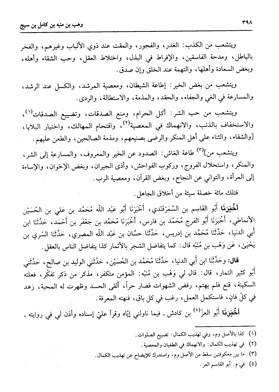 ويتشعب من الكذب الغدر والفجور والمقت عند ذوي الألباب وغيرهم والفخر بالباطل ومدحة الفاسقين والإفراط في البذل واختلاط العقل وحب الشقاء وأهله وبغض السعادة وأهلها والتهمة عند الخلق وإن صدق ويتشعب من بغض الخير إطاعة الشيطان ومعصية المرشد والكسل عند الرشد والمسارعة في الغي والجفاء والحقد والمذمة والاستطاله والردى ويتشعب من حب الشر أكل الحرام ومنع الصدقات وتضييع الصدقات (1) والاستخفاف بالذنب والانهماك في المعصية (2) واقتحام المهالك واختيار البلايا والشقاء والثناء على أهل المنكر والرضى بصنيعهم ومذمة الصالحين والطعن عليهم ويتشعب من (3) طاعة الغاش الصدود عن الخير والمعروف والمسارعة إلى الشر والمنكر واستحلال الفروج وركوب الفواحش وأذى الجيران وبغض الإخوان والإساءة إلى المرأة والتواني عن النجاح وبغض القرآن ومعصية الرب فتلك مائة خصلة سيئة من أخلاق الجاهل أخبرنا أبو القاسم بن السمرقندي أخبرنا أبو عبد الله محمد بن علي بن الحسين الأنماطي أخبرنا أبو الفرج محمد بن فارس أخبرنا محمد بن جعفر بن أحمد حدثنا ابن أبي الدنيا حدثنا محمد بن إدريس حدثنا حسان بن عبد الله المصري حدثنا السري بن يحيى هن وعن وهب بن منبه قال كما يتفاضل الشجر بالأثمار كذا يتفاضل الناس بالعقل قال وحدثنا ابن أبي الدنيا حدثنا محمد بن الحسين حدثني الوليد بن صالح حدثني أبو كثير التمار قال قال لي وهب بن منبه المؤمن متكفر مذكر من ذكر تفكر فعلته السكينة قنع فلم يهتم رفض الشهوات فصار حرا ألقى الحسد وظهرت له المحبة زهد في كل فان فاستكمل العمل رغب في كل باق فنهته المعرفة أخبرنا أبو العز (4) بن كادش فيما ناولني إياه وقرأ علي إسناده وأذن لي في روايته
