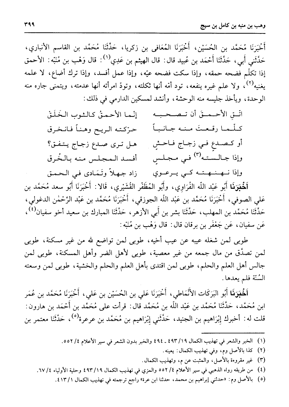 أخبرنا محمد بن الحسين أخبرنا المعافى بن زكريا حدثنا محمد بن القاسم الأنباري حدثني أبي حدثنا أحمد بن عبيد قال قال الهيثم بن عدي (1) قال وهب بن منبه الأحمق إذا تكلم فضحه حمقه وإذا سكت فضحه عيه وإذا عمل أفسد وإذا ترك أضاع لا علمه يغنيه (2) ولا علم غيره ينفعه تود أمه أنها ثكلته وتود امرأته أنها عدمته ويتمنى جاره منه الوحدة ويأخذ جليسه منه الوحشة وأنشد لمسكين الدارمي في ذلك اتق الأحمق أن تصحبه * إنما الأحمق كالثوب الخلق كلما رقعت منه جانبا * حركته الريح وهنا فانخرق أو كصدع في زجاج فاحش * هل ترى صدع زجاج يتفق وإذا جالسته (3) في مجلس * أفسد المجلس منه بالخرق وإذا نهنهته كي يرعوي * زاد جهلا وتمادى في الحمق * أخبرنا أبو عبد الله الفراوي وأبو المظفر القشيري قالا أخبرنا أبو سعد محمد بن علي الصوفي أخبرنا محمد بن عبد الله الجوزقي أخبرنا محمد بن عبد الرحمن الدغولي حدثنا محمد بن المهلب حدثنا بشر بن أبي الأزهر حدثنا المبارك بن سعيد أخو سفيان (4) عن سفيان عن جعفر بن برقان قال قال وهب بن منبه طوبى لمن شغله عيبه عن عيب أخيه طوبي لمن تواضع لله من غير مسكنة طوبى لمن تصدق من مال جمعه من غير معصية طوبى لأهل الضر وأهل المسكنة طوبى لمن جالس أهل العلم والحلم طوبى لمن افتدى بأهل العلم والحلم والخشية طوبى لمن وسعته السنة فلم يعدها أخبرنا أبو البركات الأنماطي أخبرنا علي بن الحسين بن علي أخبرنا محمد بن عمر ابن محمد حدثنا محمد بن عبد الله بن محمد قال قرأت على محمد بن أحمد بن هارون قلت له أخبرك إبراهيم بن الجنيد حدثني إبراهيم بن محمد بن عرعرة (5) حدثنا معتمر بن