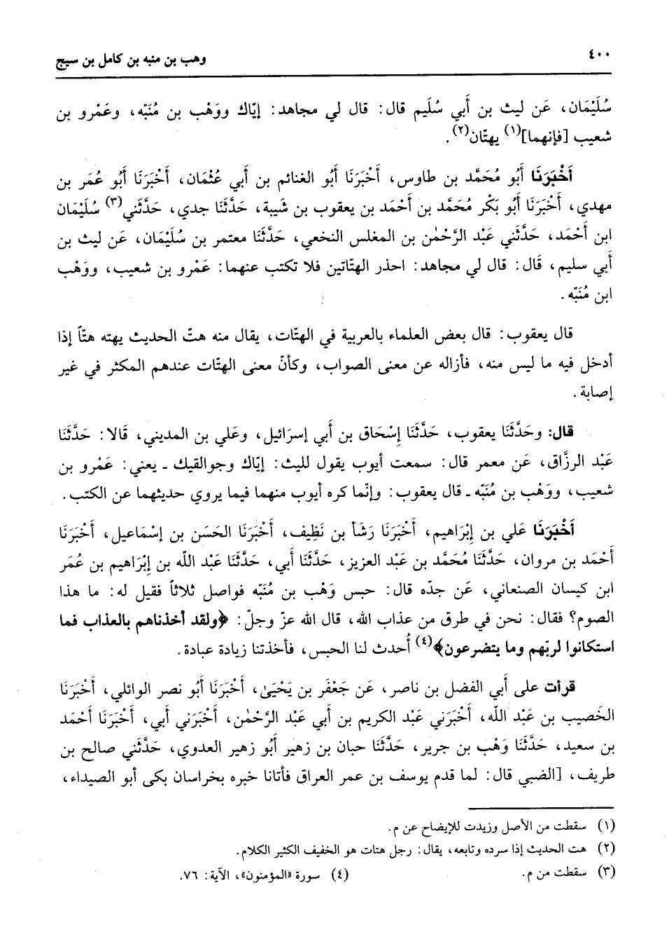 سليمان عن ليث بن أبي سليم قال قال لي مجاهد إياك ووهب بن منبه وعمرو بن شعيب فإتهما (1) يهتان (2) أخبرنا أبو محمد بن طاوس أخبرنا أبو الغنائم بن أبي عثمان أخبرنا أبو عمر بن مهدي أخبرنا أبو بكر محمد بن أحمد بن يعقوب بن شيبة حدثنا جدي حدثني (3) سليمان ابن أحمد حدثني عبد الرحمن بن المغلس النخعي حدثنا معتمر بن سليمان عن ليث بن أبي سليم قال قال لي مجاهد احذر الهتاتين فلا تكتب عنهما عمرو بن شعيب ووهب ابن منبه قال يعقوب قال بعض العلماء بالعربية في الهتات يقال منه هت الحديث يهته هتا إذا أدخل فيه ما ليس منه فأزاله عن معنى الصواب وكأن معنى الهتات عندهم المكثر في غير إصابة قال وحدثنا يعقوب حدثنا إسحاق بن أبي إسرائيل وعلي بن المديني قالا حدثنا عبد الرزاق عن معمر قال سمعت أيوب يقول لليث إياك وجوالقيك يعني عمرو بن شعيب ووهب بن منبه قال يعقوب وإنما كره أيوب منهما فيما يروي حديثهما عن الكتب أخبرنا علي بن إبراهيم أخبرنا رشأ بن نظيف أخبرنا الحسن بن إسماعيل أخبرنا أحمد بن مروان حدثنا محمد بن عبد العزيز حدثنا أبي حدثنا عبد الله بن إبراهيم بن عمر ابن كيسان الصنعاني عن جدة قال حبس وهب بن منبه فواصل ثلاثا فقيل له ما هذا الصوم فقال نحن في طرق من عذاب الله قال الله عز وجل " ولقد أحذناهم بالعذاب فما استكانوا لربهم وما يتضرعون " أحدث لنا الحبس فأخذتنا زيادة عبادة (4) قرأت على أبي الفضل بن ناصر عن جعفر بن يحيى أخبرنا أبو نصر الوائلي أخبرنا الخصيب بن عبد الله أخبرني عبد الكريم بن أبي عبد لرحمن أخبرني أبي أخبرنا أحمد بن سعيد حدثنا وهب بن جرير حدثنا حبان بن زهير أبو زهير العدوي حدثني صالح بن طريف الضبي قال لما قدم يوسف بن عمر العراق فأتانا خبره بخراسان بكى أبو الصيداء