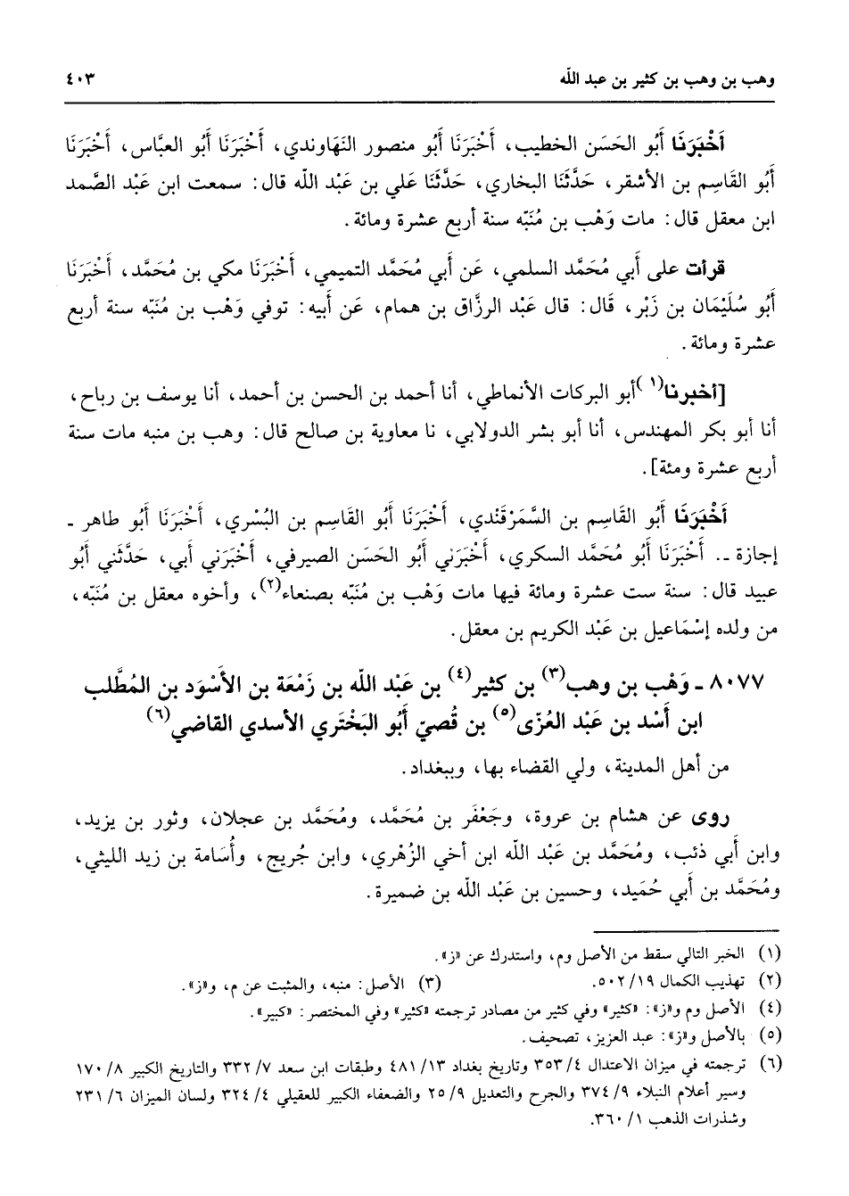 أخبرنا أبو الحسن الخطيب أخبرنا أبو منصور النهاوندي أخبرنا أبو العباس أخبرنا أبو القاسم بن الأشقر حدثنا البخاري حدثنا علي بن عبد الله قال سمعت ابن عبد الصمد ابن معقل قال مات وهب بن منبه سنة أربع عشرة ومائة قرأت على أبي محمد السلمي عن أبي محمد التميمي أخبرنا مكي بن محمد أخبرنا أبو سليمان بن زبر قال قال عبد الرزاق بن همام عن أبيه توفي وهب بن منبه سنة أربع عشرة ومائة أخبرنا (1) أبو البركات الأنماطي أنا أحمد بن الحسن بن أحمد أنا يوسف بن رباح أنا أبو بكر المهندس أنا أبو بشر الدولابي نا معاوية بن صالح قال وهب بن منبه مات سنة أربع عشرة ومئة أخبرنا أبو القاسم بن السمرقندي أخبرنا أبو القاسم بن البسري أخبرنا أبو طاهر إجازة أخبرنا أبو محمد السكري أخبرني أبو الحسن الصيرفي أخبرني أبي حدثني أبو عبيد قال سنة ست عشرة ومائة فيها مات وهب بن منبه بصنعاء (2) وأخوه معقل بن منبه من ولده إسماعيل بن عبد الكريم بن معقل