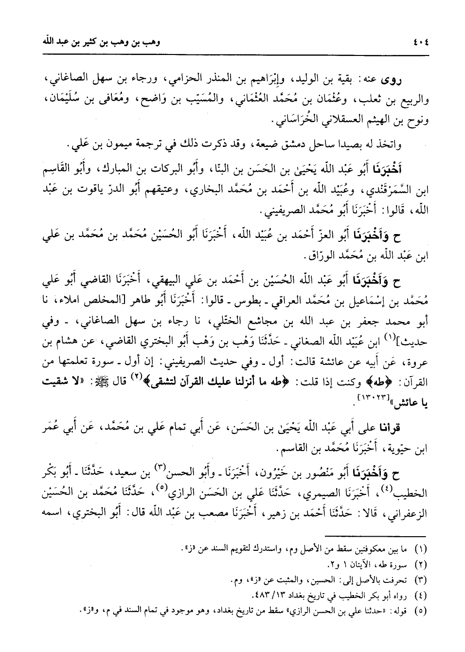 روى عنه بقية بن الوليد وإبراهيم بن المنذر الحزامي ورجاء بن سهل الصاغاني والربيع بن ثعلب وعثمان بن محمد العثماني والمسيب بن واضح ومعافى بن سليمان ونوح بن الهيثم العسقلاني الخراساني واتخذ له بصيدا ساحل دمشق ضيعة وقد ذكرت ذلك في ترجمة ميمون بن علي أخبرنا أبو عبد الله يحيى بن الحسن بن البنا وأبو البركات بن المبارك وأبو القاسم ابن السمرقندي وعبيد الله بن أحمد بن محمد البخاري وعتيقهم أبو الدر ياقوت بن عبد الله قالوا أخبرنا أبو محمد الصريفيني ح وأخبرنا أبو العز أحمد بن عبيد الله أخبرنا أبو الحسين محمد بن محمد بن علي ابن عبد الله بن محمد الوراق وأخبرنا أبو عبد الله الحسين بن أحمد بن علي البيهقي أخبرنا القاضي أبو علي محمد بن إسماعيل بن محمد العراقي بطوس قالوا أخبرنا أبو طاهر المخلص املاء نا أبو محمد جعفر بن عبد الله بن مجاشع الختلي نا رجاء بن سهل الصاغاني وفي حدثي (1) ابن عبيد الله الصغاني حدثنا وهب بن وهب أبو البختري القاضي عن هشام بن عروة عن أبيه عن عائشة قالت أول وفي حديث الصريفيني إن أول سورة تعلمتها من القرآن " طه " وكنت إذا قلت " طه ما أنزلنا عليك القرآن لتشقى " (2) قال (صلى الله عليه وسلم) لا شقيت يا عائش قرأنا على أبي عبد الله يحيى بن الحسن عن أبي تمام علي بن محمد عن أبي عمر ابن حيوية أخبرنا محمد بن القاسم وأخبرنا أبو منصور بن خيرون أخبرنا وأبو الحسن (3) بن سعيد حدثنا أبو بكر الخطيب (4) أخبرنا الصيمري حدثنا علي بن الحسن الرازي (5) حدثنا محمد بن الحسين الزعفراني قالا حدثنا أحمد بن زهير أخبرنا مصعب بن عبد الله قال أبو البختري اسمه