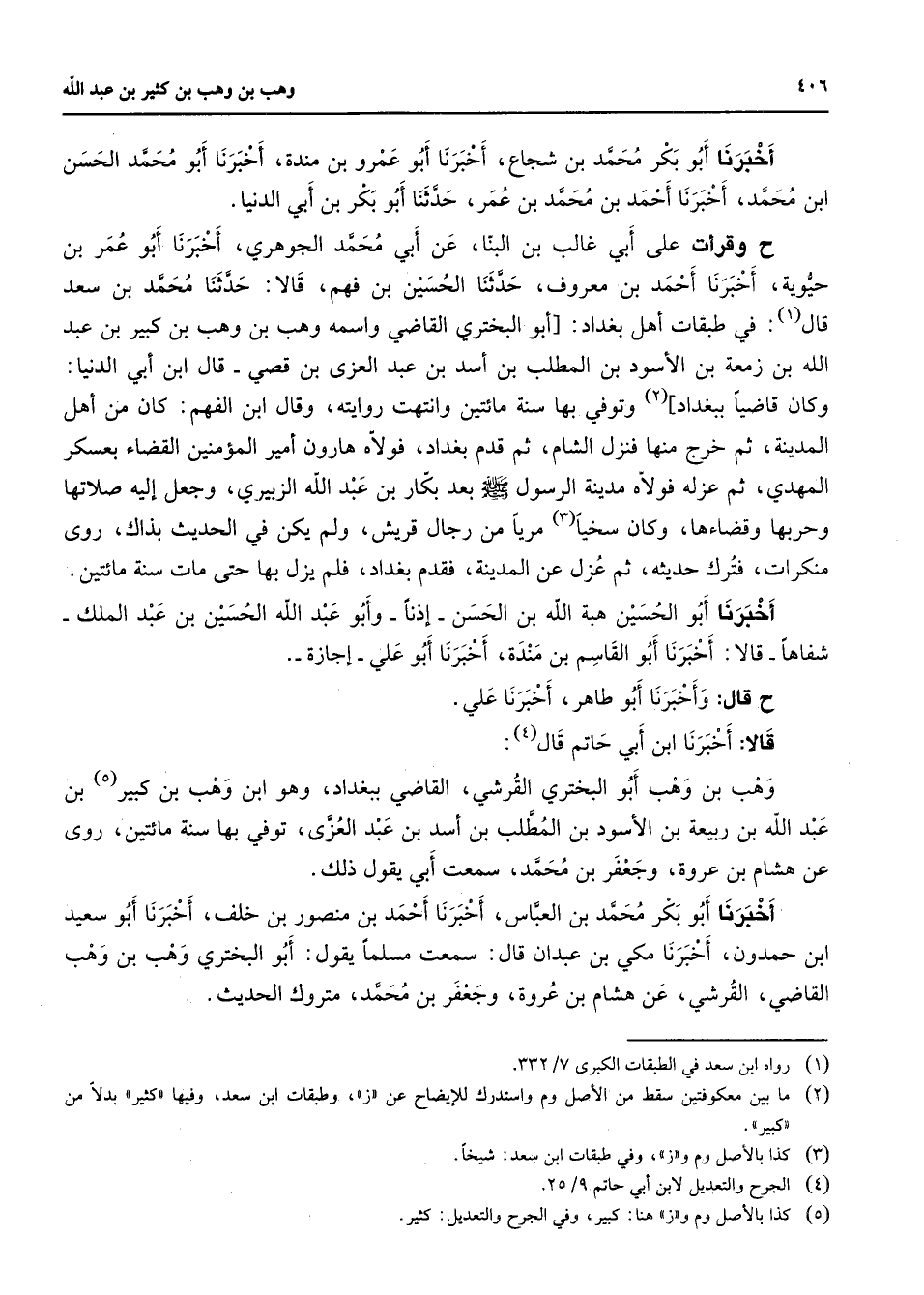 أخبرنا أبو بكر محمد بن شجاع أخبرنا أبو عمرو بن مندة أخبرنا أبو محمد الحسن ابن محمد أخبرنا أحمد بن محمد بن عمر حدثنا أبو بكر بن أبي الدنيا ح وقرأت على أبي غالب بن البنا عن أبي محمد الجوهري أخبرنا أبو عمر بن حيوية أخبرنا أحمد بن معروف حدثنا الحسين بن فهم قالا حدثنا محمد بن سعد قال (1) في طبقات أهل بغداد أبو البختري القاضي واسمه وهب بن وهب كبير بن عبد الله بن زمعة بن الأسود بن المطلب بن أسد بن عبد العزى بن قصي قال ابن ابي الدنيا وكان قاضيا ببغداد (2) وتوفي بها سنة مائتين وانتهت روايته وقال ابن الفهم كان من أهل المدينة ثم خرج منها فنزل الشام ثم قدم بغداد فولاه هارون أمير المؤمنين القضاء بعسكر المهدي ثن عزله فولاه مدينة الرسول (صلى الله عليه وسلم) بعد بكار بن عبد الله الزبيري وجعل إليه صلاتها وحربها وقضاءها وكان سخيا (3) مريا من رجال قريش ولم يكن في الحديث بذاك روى منكرات فترك حديثه ثم عزل عن المدينة فقدم بغداد فلم يزل بها حتى مات سنة مائتين أخبرنا أبو الحسين هبة الله بن الحسن إذنا وأبو عبد الله الحسين بن عبد الملك شفاها قالا أخبرنا أبو القاسم بن مندة أخبرنا أبو علي إجازة قال وأخبرنا أبو طاهر أخبرنا علي قالا أخبرنا ابن أبي حاتم قال (4) وهب بن وهب أبو البختري القرشي القاضي ببغداد وهو ابن وهب بن كبير (5) بن عبد الله بن ربيعة بن الأسود بن المطلب بن أسد بن عبد العزى توفي بها سنة مائتين روى عن هشام بن عروة وجعفر بن محمد سمعت أبي يقول ذلك أخبرنا أبو بكر محمد بن العباس أخبرنا أحمد بن منصور بن خلف أخبرنا أبو سعيد ابن حمدون أخبرنا مكي بن عبدان قال سمعت مسلما يقول أبو البختري وهب بن وهب القاضي القرشي عن هشام بن عروة وحعفر بن محمد متروك الحديث