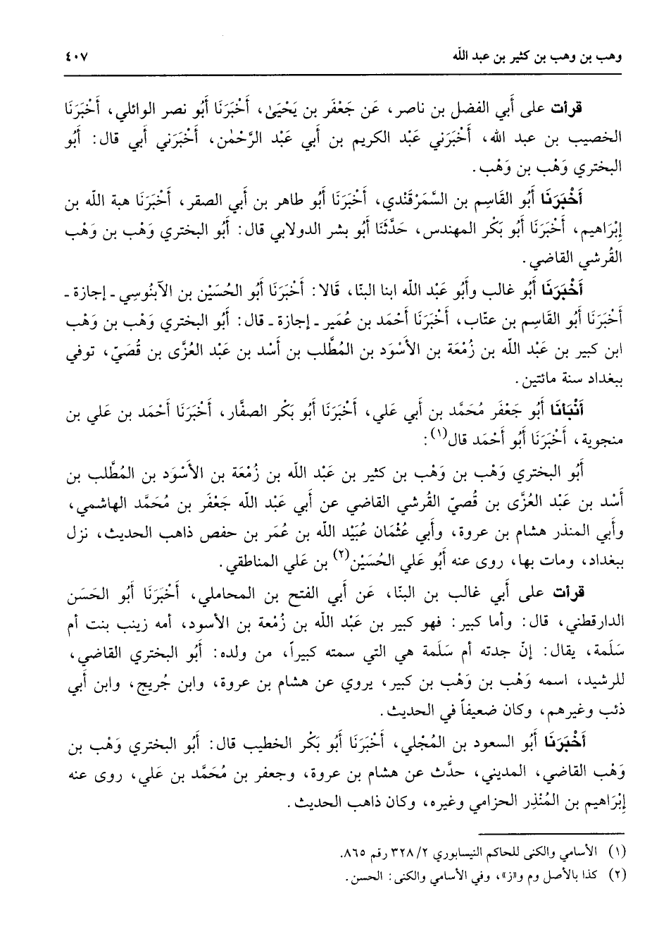 قرأت على أبي الفضل بن ناصر عن جعفر بن يحيى أخبرنا أبو نصر الوائلي أخبرنا الخصيب بن عبد الله أخبرني عبد الكريم بن أبي عبد الرحمن أخبرني أبي قال أبو البختري وهب بن وهب أخبرنا أبو القاسم بن السمرقندي أخبرنا أبو طاهر بن أبي الصقر أخبرنا هبة الله بن إبراهيم أخبرنا أبو بكر المهندس حدثنا أبو بشر الدولابي قال أبو البختري وهب بن وهب القرشي القاضي أخبرنا أبو غالب وأبو عبد الله ابنا البنا قالا أخبرنا أبو الحسين بن الآبنوسي إجازة أخبرنا أبو القاسم بن عتاب أخبرنا أحمد بن عمير إجازة قال أبو البختري وهب بن وهب ابن كبير بن عبد الله بن زمعة بن الأسود بن المطلب بن أسد بن عبد العزى بن قصي توفي ببغداد سنة مائتين أنبأنا أبو جعفر محمد بن أبي علي أخبرنا أبو بكر الصفار اخبرنا أحمد بن علي بن منجوية أخبرنا أبو أحمد قال (1) أبو البختري وهب بن وهب بن كثير بن عبد الله بن زمعة بن الأسود بن المطلب بن أسد بن عبد العزى بن قصي القرشي القاضي عن أبي عبد الله جعفر بن محمد الهاشمي وأبي المنذر هشام بن عروة وأبي عثمان عبيد الله بن عمر بن حفص داهب الحديث نزل ببغداد ومات بها روى عنه أبو علي الحسين (2) بن علي المناطقي قرأت على أبي غالب بن البنا عن أبي الفتج بن المحاملي أخبرنا أبو الحسن الدارقطني قال وأما كبير فهو كبير بن عبد الله بن زمعة بن الأسود أمه زينب بنت أم سلمة يقال إن جدته أم سلمة هي التي سمته كبيرا من ولده أبو البختري القاضي للرشيد يقال اسمه وهب بن وهب بن كبير يروي عن هشام بن عروة وابن جريج وابن أبي ذئب وغيرهم وكان ضعيفا في الحديث أخبرنا أبو السعود بن المجلي أخبرنا أبو بكر الخطيب قال أبو البختري وهب بن وهب القاضي المديني حدث عن هشام بن عروة وجعفر بن محمد بن علي روى عنه إبراهيم بن المنذر الحزامي وغيره وكان ذاهب الحديث