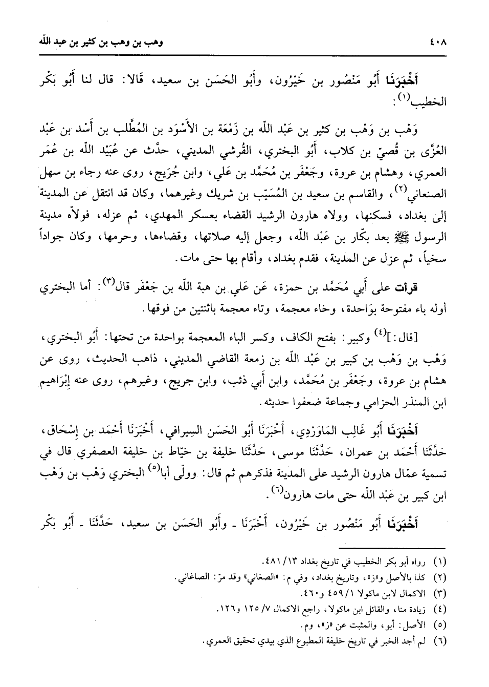 الصنعاني (2) والقاسم بن سعيد بن المسيب بن شريك وغيرهما وكان قد انتقل عن المدينة إلى بغداد فسكنها وولاه هارون الرشسد القضاء بعسكر المهدي ثم عزله فولاه مدينة الرسول (صلى الله عليه وسلم) بعد بكار بن عبد الله وجعل إليه صلاتها وقضاءها وحرمها وكان جوادا سخيا ثم عزل عن لمدينة فقدم بغداد وأقام بها حتى مات قرأت على أبي محمد بن حمزة عن علي بن هبة الله بن جعفر قال (3) أما البختري أوله باء مفتوحه بواحدة وخاء معجمة وتاء معجمة باثنتين من فوقها قال (4) وكبير بفتح الكاف وكسر الباء المعجمة بواحده من تحتها أبو البختري وهب ن وهب بن كبير بن عبد الله بن زمعة القاضي المديني ذاهب الحديث روى عن هشام بن عروة وجعفر بن محمد وابن أبي ذئب وابن جريح وغيرهم روى عنه إبراهيم ابن المنذر الحزامي وجماعة ضعفوا حديثه أخبرنا أبو غالب الماوردي أخبرنا أبو الحسن السيرافي أخبر نا أحمد بن إسحاق حدثنا أحمد بن عمران حدثنا موسى حدثنا خليفة بن خياط بن خليفة العصفري قال في تسمية عمال هارون الرشيد على المدينة فذكرم ثم قال وولى أبا (5) البختري وهب بن وهب ابن كبير بن عبد الله حتى مات هارون (6) أخبرنا أبو منصور بن خيرون أخبرنا وأبو الحسن بن سعيد أبو يكر