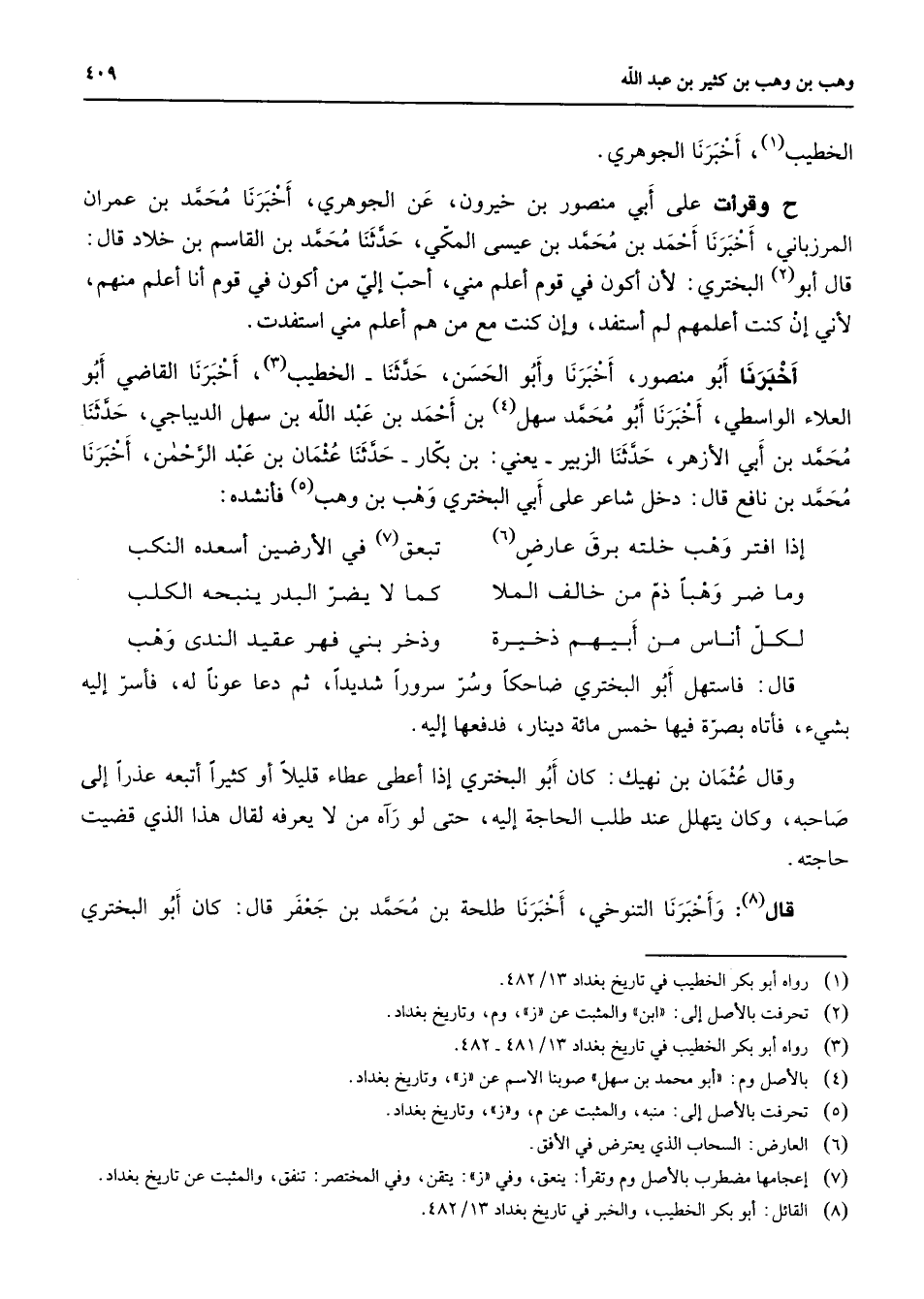 الخطيب (1) أخبرنا الجوهري ح وقرأت على أبي منصور بن خيرون عن الجوهري أخبرنا محمد بن عمران المرزباني أخبرنا أحمد بن محمد بن عيسى المكي حدثنا محمد بن القاسم بن خلاد قال قال أبو (2) البختري لأن أكون في قوم أعلم مني أحب إلي من أكون في قوم أنا أعلم منهم لأني إن كنت أعلمهم لم أستفد وإن كنت مع من هم أعلم مني استفدت أخبرنا أبو منصور أخبرنا أبو الحسن حدثنا الخطيب (3) أخبرنا القاضي أبو العلاء الواسطي أخبرنا أبو محمد سهل (4) بن أحمد بن عبد الله بن سهل الديباجي حدثنا محمد بن أبي الأزهر حدثنا الزبير يعني بن بكار حدثنا عثمان بن عبد الرحمن أخبرنا محمد بن نافع قال دخل شاعر على أبي البختري وهب بن وهب (5) فأنشده * إذا افتر وهب خلته برق عارض (6) تبعق (7) في الأرضين أسعده النكب وما ضر وهبا ذم من خالف الملا * كما لا يضر البدر ينبحه الكلب لكل أناس من أبيهم ذخيرة * وذخر بني فهر عقيد الندى وهب * قال فاستهل أبو البختري ضاحكا وسر سرورا شديدا ثم دعا عونا له فأسر إليه بشئ فأتاه بصرة فيها خمس مائه دينار فدفعها إليه وقال عثمان بن نهيك كان أبو البختري إذا أعطى عطاء قليلا أو كثيرا أتبعه عذرا إلى صاحبه وكان يتهلل عند طلب الحاجة إليه حتى لو رآه من لا يعرفه لقال هذا الذي قضيت حاجته قال (8) وأخبرنا التنوخي أخبرنا طلحة بن محمد بن جعفر قال كان أبو البختري