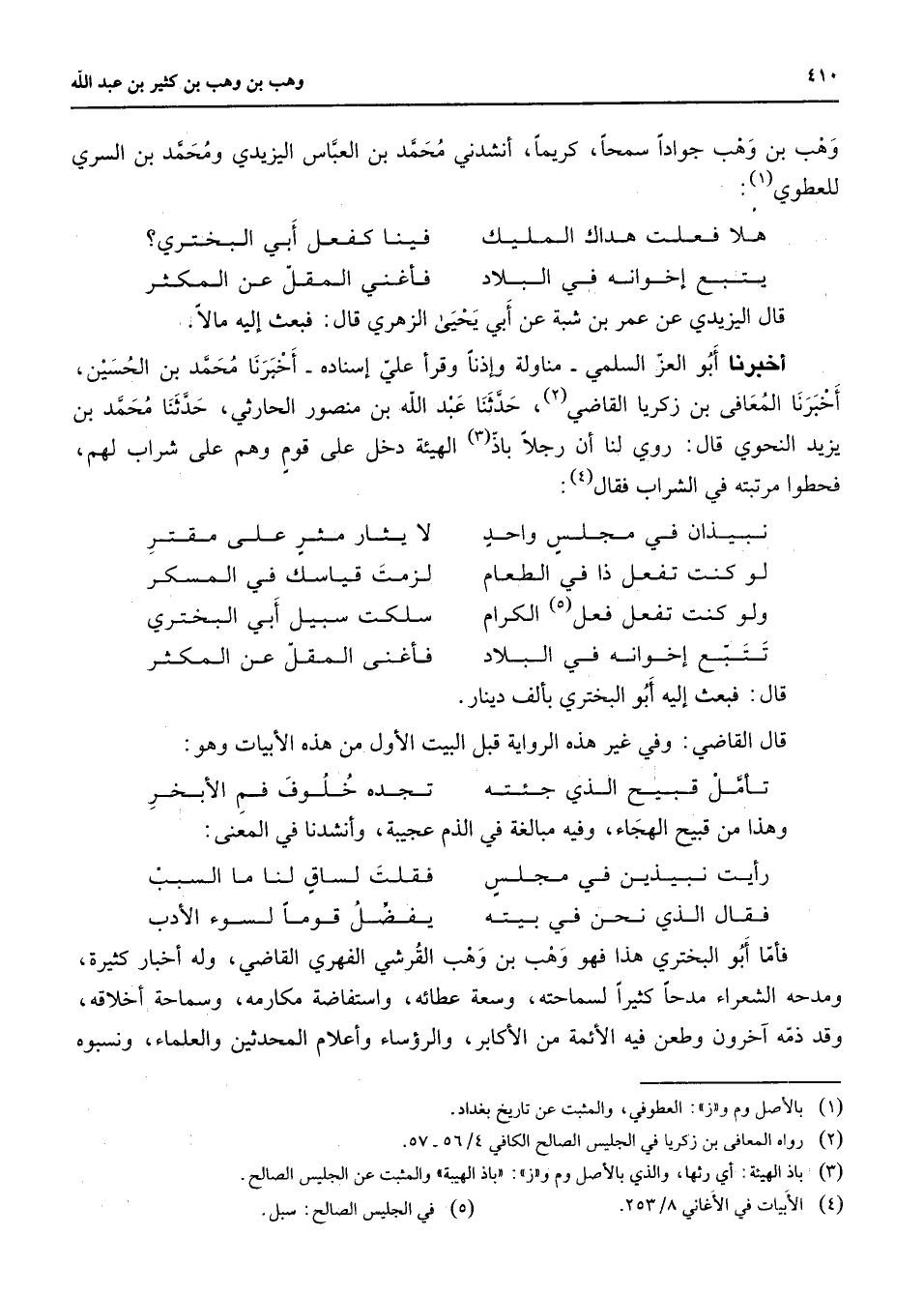 وهب بن وهب جوادا سمحا كريما أنشدني محمد بن العباس اليزيدي ومحمد بن السري للعطوي (1) * هلا فعلت هداك المليك * فينا كفعل أبي البختري يتبع إخوانه في البلاد * فأغنى المقل عن المكثر * قال اليزيدي عن عمر بن شبة عن أبي يحيى الزهري قال فبعث إليه مالا أخبرنا أبو العز السلمي مناولة وإذنا وقرأ علي إسناده أخبرنا محمد بن الحسين أخبرنا المعافى بن زكريا القاضي (2) حدثنا عبد الله بن منصور الحارثي حدثنا محمد بن يزيد النحوي قال روي لنا أن رجلا باذ (3) الهيئة دخل على قوم وهم على شراب لهم فحطوا مرتبته في الشراب فقال (4) * نبيذان في مجلس واحد * لا يثار مثر على مقتر لو كنت تفعل ذا في الطعام * لزمت قياسك في المسكر ولو كنت تفعل فعل (5) الكرام * سلكت سبيل أبي البختري تتبع إخوانه في البلاد * فأغنى المقل عن المكثر * قال فبعث إليه أبو البختري بألف دينار قال القاضي وفي غير هذه الرواية قبل البيت الأول من هذه الأبيات وهو * تأمل قبيح الذي جئته * تجده خلوف فم الأبخر * وهذا من قبيح الهجاء وفيه مبالغة في الذم عجيبة وأنشدنا في المعنى * رايت نبيذين في مجلس * فقلت لساق لنا ما السبب فقال الذي نحن في بيته * يفضل قوما لسوء الأدب * فأما أبو البختري هذا فهو وهب بن وهب القرشي الفهري القاضي وله أخبار كثيرة ومدحه الشعراء مدحا كثيرا لسماحته وسعة عطائه واستفاضة مكارمه وسماحة أخلاقه وقد ذمه آخرون وطعن فيه الأئمة من الأكابر والرؤساء وأعلام المحدثين والعلماء ونسبوه