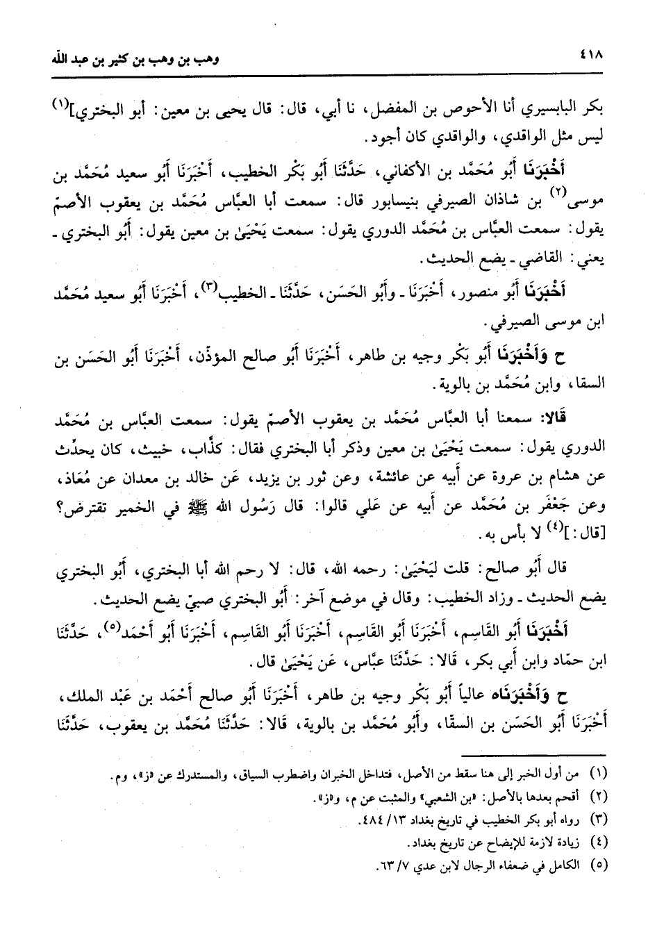 بكر البابسيري أنا الأحوص بن المفضل نا أبي قال قال يحيى بن معين أبو البختري (1) ليس مثل الواقدي والواقدي كان أجود أخبرنا أبو محمد بن الأكفاني حدثنا أبو بكر الخطيب أخبرنا أبو سعيد محمد بن موسى (2) بن شاذان الصيرفي بنيسابور قال سمعت أبا العباس محمد بن يعقوب الأصم يقول سمعت العباس بن محمد الدوري يقول سمعت يحيى بن معين يقول أبو البختري يعني القاضي يضع الحديث أخبرنا أبو منصور أخبرنا وأبو الحسن حدثنا الخطيب (3) أخبرنا أبو سعيد محمد ابن موسى الصيرفي وأخبرنا أبو بكر وجيه بن طاهر أخبرنا أبو صالح المؤذن أخبرنا أبو الحسن بن السقا وابن محمد بن بالوية قالا سمعنا أبا العباس محمد بن يعقوب الأصم يقول سمعت العباس محمد بن الدوري يقول سمعت يحيى بن معين وذكر أبا البختري فقال كذاب خبيث كان يحدث عن هشام بن عروة عن أبيه عن عائشة وعن ثور بن يزيد عن خالد بن معدان عن معاذ وعن جعفر بن محمد عن أبيه عن علي قالوا قال رسول الله (صلى الله عليه وسلم) في الخمير تقترض قال (4) لا بأس به قال أبو صالح قلت ليحيى رحمه الله قال لا رحم الله أبا البختري أبو البختري يضع الحديث وزاد الخطيب وقال في موضع آخر أبو البختري صبي يضع الحديث أخبرنا أبو القاسم أخبرنا أبو القاسم أخبرنا أبو القاسم أخبرنا أبو أحمد (5) حدثنا ابن حماد وابن أبي بكر قالا حدثنا عباس عن يحيى قال وأخبرناه عاليا أبو بكر وجيه بن طاهر أخبرنا أبو صالح أحمد بن عبد الملك أخبرنا أبو الحسن بن السقا وأبو محمد بن بالوية قالا حدثنا محمد بن يعقوب حدثنا