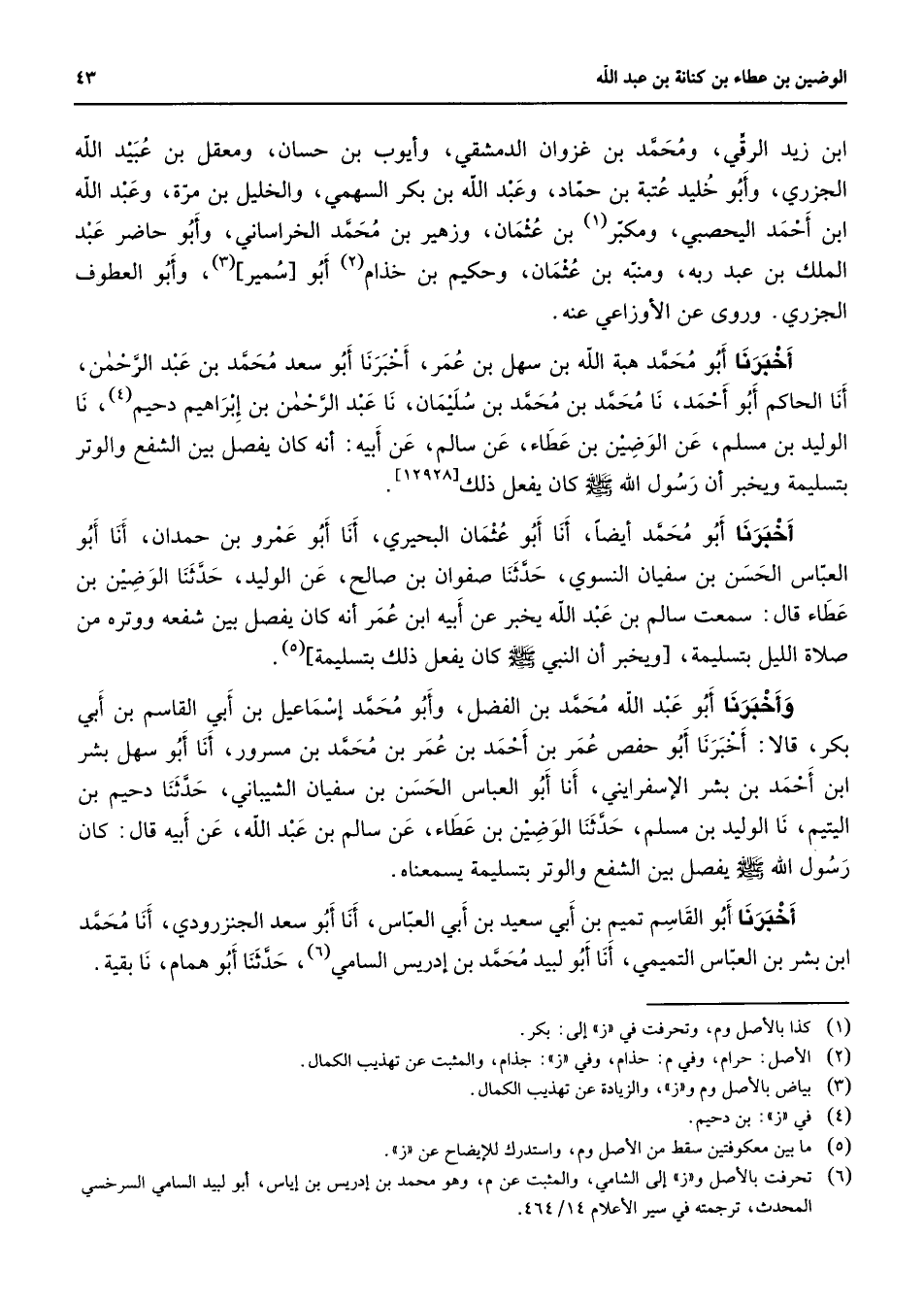 ابن زيد الرقي ومحمد بن غزوان الدمشفي وأيوب بن حسان ومعقل بن عبيد الله الجرزي وأبو خليد عتبة بن حماد وعبد الله بن بكر السهمي والخليل بن مرة وعبد الله ابن أحمد اليحصبي ومكبر (1) بن عثمان وزهير بن محمد الخراساني وأبو حاضر عبد الملك بن عبد ربه ومنبه بن عثمان وحكيم بن خدام (2) أبو سمير (3) وأبو العطوف الجزري وروى عن الأوزاعي عنه أخبرنا أبو محمد هبة الله بن سهل بن عمر أخبرنا أبو سعد محمد بن عبد الرحمن أنا الحاكم أبو محمد أبو أحمد نا محمد بن محمد بن سليمان نا عبد الرحمن بن إبراهيم دحيم (4) نا الوليد بن مسلم عن الوضين بن عطاء عن سالم عن أبيه أنه كان يفصل بين الشفع والوتر بتسليمة ويخبر أن رسول الله (صلى الله عليه وسلم) كان يفعل ذلك أخبرنا أبو محمد أيضا أنا أبو عثمان البحيري أنا أبو عمرو بن حمدان أنا أبو العباس الحسن بن سفيان النسوي حدثنا صفوان بن صالح عن الوليد حدثنا الوضين بن عطاء قال سمعت سالم بن عبد الله يخبر عن أبيه ابن عمر أنه كان بفصل بين شفعه ووتره من صلاة الليل بتسليمة ويخبر أن النبي (صلى الله عليه وسلم) كان بفعل ذلك بتسليمة (5) أخبرنا أبو عبد الله محمد بن الفضل وأبو محمد إسماعيل بن أبي القاسم بن أبي بكر قالا أخبرنا أبو حفص عمر بن أحمد بن عمر بن محمد بن مسرور أنا أبو سهل بشر ابن أحمد بن بشر الإسفرايني أنا أبو العباس الحسن بن سفيان الشيباني حدثنا دحيم بن اليتيم نا الوليد بن مسلم حدثنا الوضين بن عطاء عن سالم بن عبد الله عن أبيه قال كان رسول الله (صلى الله عليه وسلم) بفصل بين الشفع والوتر بتسليمة يسمعناه أخبرنا أبو القاسم تميم بن أبي سعيد بن أبي العباس أنا أبو سعد الجنزرودي أنا محمد ابن بشر بن العباس التميمي أنا أبو لبيد محمد بن إدريس السامي (6) حدثنا أبو همام نا بقية