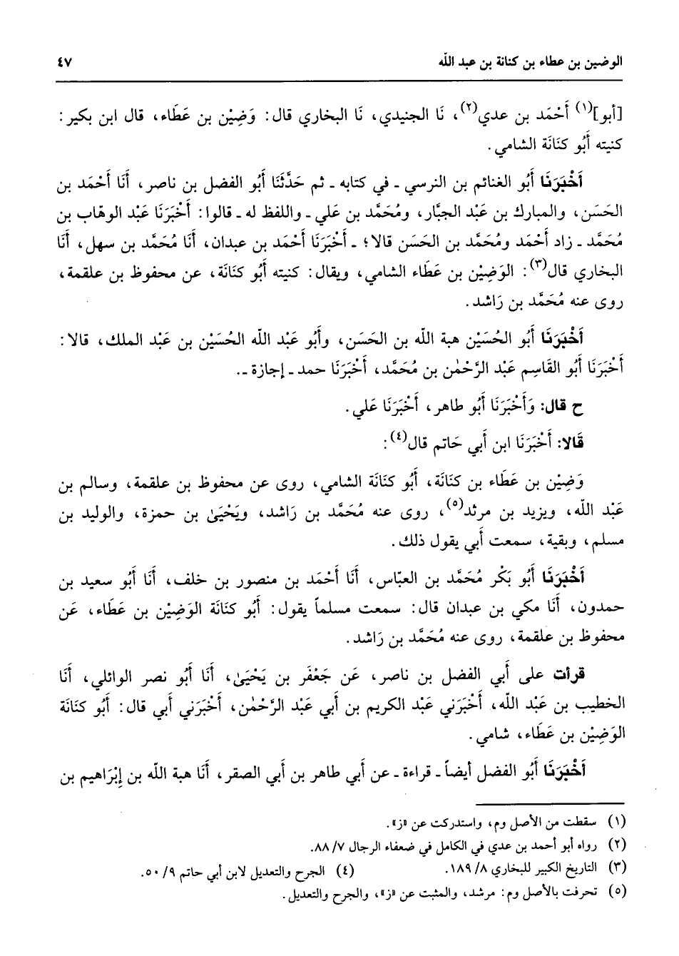 أبو (1) أحمد بن عدي (2) نا الجنيدي نا البخاري قال وضين بن عطاء قال ابن بكير كنيته أبو كنانة الشامي أخبرنا أبو الغنائم بن النرسي في كتابه ثم حدثنا أبو الفضل بن ناصر أنا أحمد بن الحسن والمبارك بن عبد الجبار ومحمد بن علي واللفظ له قالوا أخبرنا عبد الوهاب بن محمد زاد أحمد ومحمد بن الحسن قالا أخبرنا أحمد بن عبدان أنا محمد بن سهل أنا البخاري قال (3) الوضين بن عطاء الشامي ويقال كنيته أبو كنانة عن محفوظ بن علقمة روى عنه محمد بن راشد أخبرنا أبو الحسين هبة الله بن الحسن وأبو عبد الله الحسين بن عبد الملك قالا أخبرنا أبو القاسم عبد الرحمن بن محمد أخبرنا محمد إجازة قال وأخبرنا أبو طاهر أخبرنا علي قالا أخبرنا إبن أبي حاتم قال (4) وضين بن عطاء بن كنانة أبو كنانة الشامي روى عن محفوظ بن علقمة وسالم بن عبد الله ويزيد بن مرثد (5) روى عنه محمد بن راشد ويحيى بن حمزة والوليد بن مسلم وبقية سمعت أبي يقول ذلك أخبرنا أبو بكر محمد بن العباس أنا أحمد بن منصور بن خلف أنا أبو سعيد بن حمدون أنا مكي بن عبدان قال سمعت مسلما يقول أبو كنانة الوضين بن عطاء عن محفوظ بن علقمة روى عنه محمد بن راشد قرأت على أبي الفضل بن ناصر عن جعفر بن يحيى أنا أبو نصر الوائلي أنا الخطيب بن عبد الله أخبرني عبد الكريم بن أبي عبد الرحمن أخبرني أبي قال أبو كنانة الوضين بن عطاء شامي أخبرنا أبو الفضل أيضا قراءة عن أبي طاهر بن أبي الصقر أناهبة الله بن إبراهيم بن