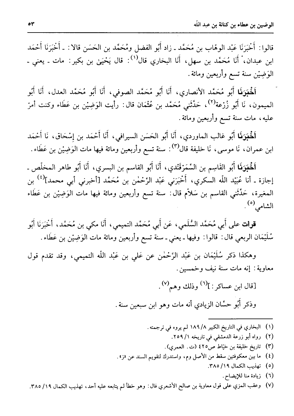 قالو أخبرنا عبد الوهاب بن محمد زاد أبو الفضل ومحمد بن الحسن قالا أخبرنا أحمد ابن عبدان أنا محمد بن سهل أنا البخاري قال (1) قال يحيى بن بكير مات يعني الوضين سنة تسع وأربعين ومائة أخبرنا أبو محمد الأنصاري أنا أبو محمد الصوفي أنا أبو محمد العدل أنا أبو الميمون نا أبو زرعة حدثني محمد بن عثمان قال رأيت الوضين بن عطاء وكنت أمر عليه مات سنة تسع وأربعين ومائة أخبرنا أبو غالب الماوردي أنا أبو الحسن السيرافي أنا أحمد بن إسحاق نا أحمد ابن عمران نا موسى نا خليفة قال (3) سنة تسع وأربعين ومائة فيها مات الوضين بن عطاء أخبرنا أبو القاسم بن السمرقندي أنا أبو القاسم بن البسري أنا أبو طاهر المخلص إجازة أنا عبيد الله السكري أخبرني عبد الرحمن بن محمد أخبرني أبي محمد (4) بن المغيرة حدثني القاسم بن سلام قال سنة تسع وأربعين ومائة فيها مات الوضين بن عطاء الشامي (5) قرأت على أبي محمد السلمي عن أبي محمد التميمي أنا مكي بن محمد أخبرنا أبو سليمان الربعي قال قالوا وفيها يعني سنة تسع وأربعين ومائة مات الوضين بن عطاء وهكذا ذكر سليمان بن عبد الرحمن عن علي بن عبد الله التميمي وقد تقدم قول معاوية إنه مات سنة نيف وخمسين قال ابن عساكر (6) وذلك وهم (7) وذكر أبو حسان الزيادي أنه مات وهو ابن سبعين سنة