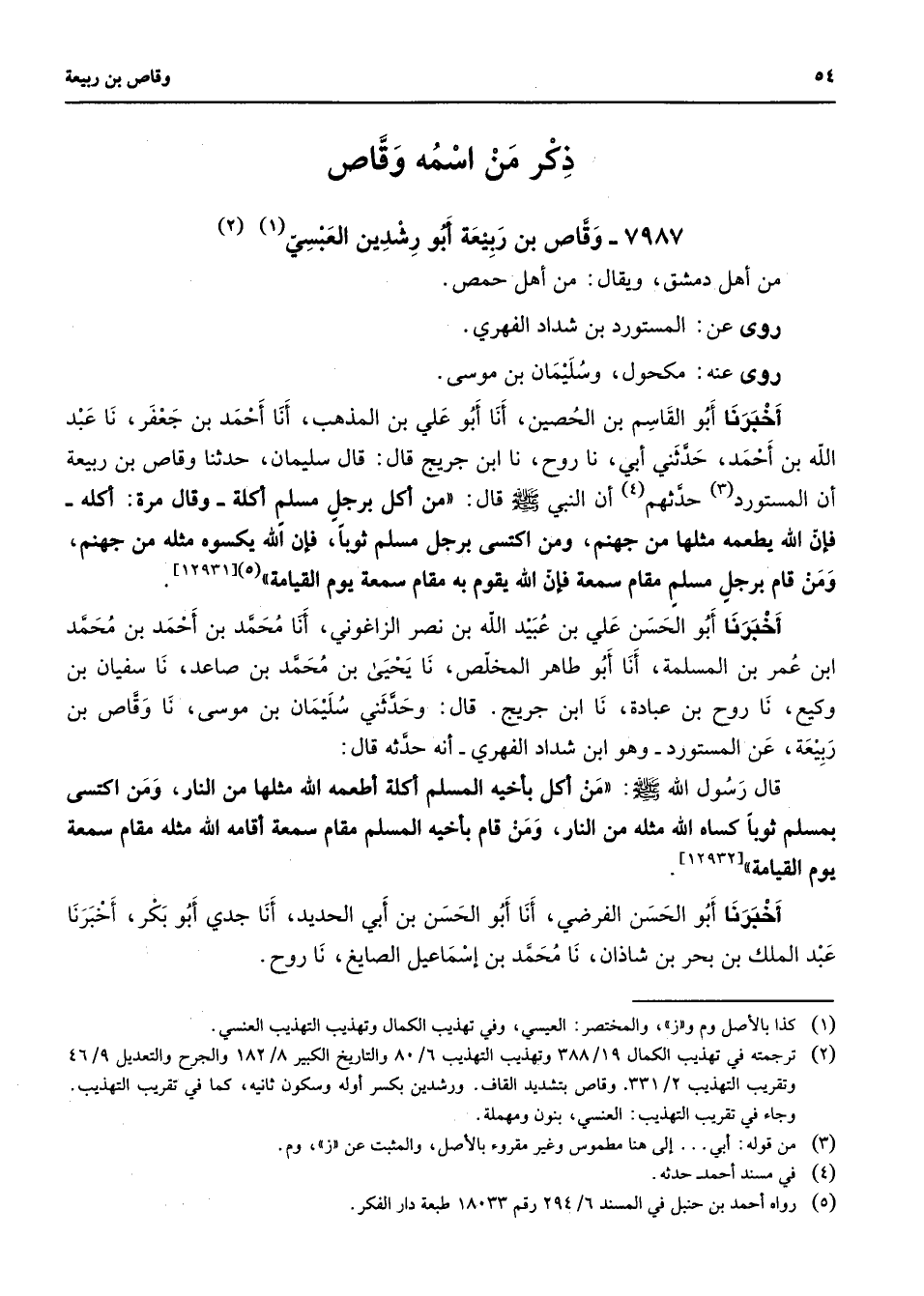 7987 - وقاص بن ربيعة أبو رشدين العبسي (1) (2) من أهل دمشق ويقال من أهل حمص روى عن المستورد بن شداد الفهري روى عنه مكحول وسليمان بن موسى أخبرنا أبو القاسم بن الحصين أنا أبو علي بن المذهب أنا أحمد بن جعفر نا عبد الله بن أحمد حدثني أبي نا روح نا ابن جريح قال قال سليمان حدثنا وقاص بن ربيعة أن المستورد (3) حدثهم (4) أن النبي (صلى الله عليه وسلم) قال من أكل برجل مسلم أكله وقال مرة أكلة فإن الله يطعمه مثلها من جهنم ومن اكتسى برجل مسلم ثوبا فإن الله يكسوه مثله من جهنم ومن قام برجل مسلم مقام سمعة فإن الله يقوم به مقام سمعة يوم القيامة (5) أخبرنا أبو الحسن علي بن عبيد الله بن نصر الزاغوني أنا محمد بن أحمد بن محمد ابن عمر بن المسلمة أنا أبو طاهر المخلص نا يحيى بن محمد بن صاعد نا سفيان بن وكيع نا روح بن عبادة نا ابن جريح قال وحدثني سليمان بن موسى نا وقاص بن ربيعة عن المستورد وهو ابن شداد الفهري أنه حدثه قال قال رسول الله (صلى الله عليه وسلم) من أكل بأخيه المسلم أكله أطعمه الله مثلها من النار ومن اكتسى بمسلم ثوبا كساه الله مثله من النار ومن قام بأخيه المسلم مقام سمعة أقامه الله مثله مقام سمعة يوم القيامة أخبرنا أبو الحسن الفرضي أنا أبو الحسن بن أبي الحديد أنا جدي أبو بكر أخبرنا عبد الملك بن بحر بن شاذان نا محمد بن إسماعيل الصايغ نا روح