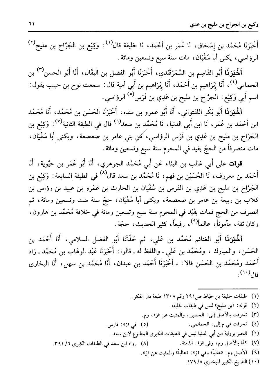 أخبرنا محمد بن إسحاق نا عمر بن أحمد نا خليفة قال (1) وكيع بن الجراح بن مليح (2) الرؤاسي يكنى أبا سفيان مات سنة سبع وتسعين ومائة أخبرنا أبو القاسم بن السمرقندي أخبرنا أبو الفضل بن البقال أنا أبو الحسن (3) بن الحمامي (4) أنا إبراهيم بن أحمد أنا إبراهيم بن أبي أمية قال سمعت نوح بن حبيب يقول اسم أبي وكيع الجراح بن مليح بن عدي بن فرس (5) الرؤاسي أخبرنا أبو بكر اللفتواني أنا أبو عمرو بن منده أخبرنا الحسن بن محمد أنا محمد ابن أحمد بن عمر نا ابن أبي الدنيا نا محمد بن سعد (6) قال في الطبقة الثانية (7) وكيع بن الجراح بن مليح بن عدي بن فرس الرؤاسي من بني عامر بن صعصعة ويكنى أبا سفيان مات منصرفا من الحج بفيد من المحرم سنة سبع وتسعين ومائة قرأت على أبي غالب بن البنا عن ابي محمد الجوهري أنا أبو عمر بن حيوية أنا أحمد بن معروف نا الحسين بن فهم نا محمد بن سعد قال (8) في الطبقة السابعة وكيع بن الجراح بن مليح بن عدي بن الفرس بن سفيان بن الحارث بن عمرو بن عبيد بن رؤاس بن كلاب بن ربيعة بن عامر بن صعصعة ويكنى أبا سفيان حج سنة ست وتسعين ومائة ثم انصرف من الحج فمات بفيد من المحرم سنة سبع وتسعين ومائة في خلافة محمد بن هارون وكان ثقة مأمونا عالما (9) رفيعا كثير الحديث حجة أخبرنا أبو الغنائم محمد بن علي ثم حدثنا أبو الفضل السلامي أنا أحمد بن الحسن والمبارك ومحمد بن علي واللفظ له قالوا أخبرنا عبد الوهاب بن محمد زاد أحمد ومحمد بن الحسن قالا أخبرنا أحمد بن عبدان أنا محمد بن سهل أنا البخاري قال (10)