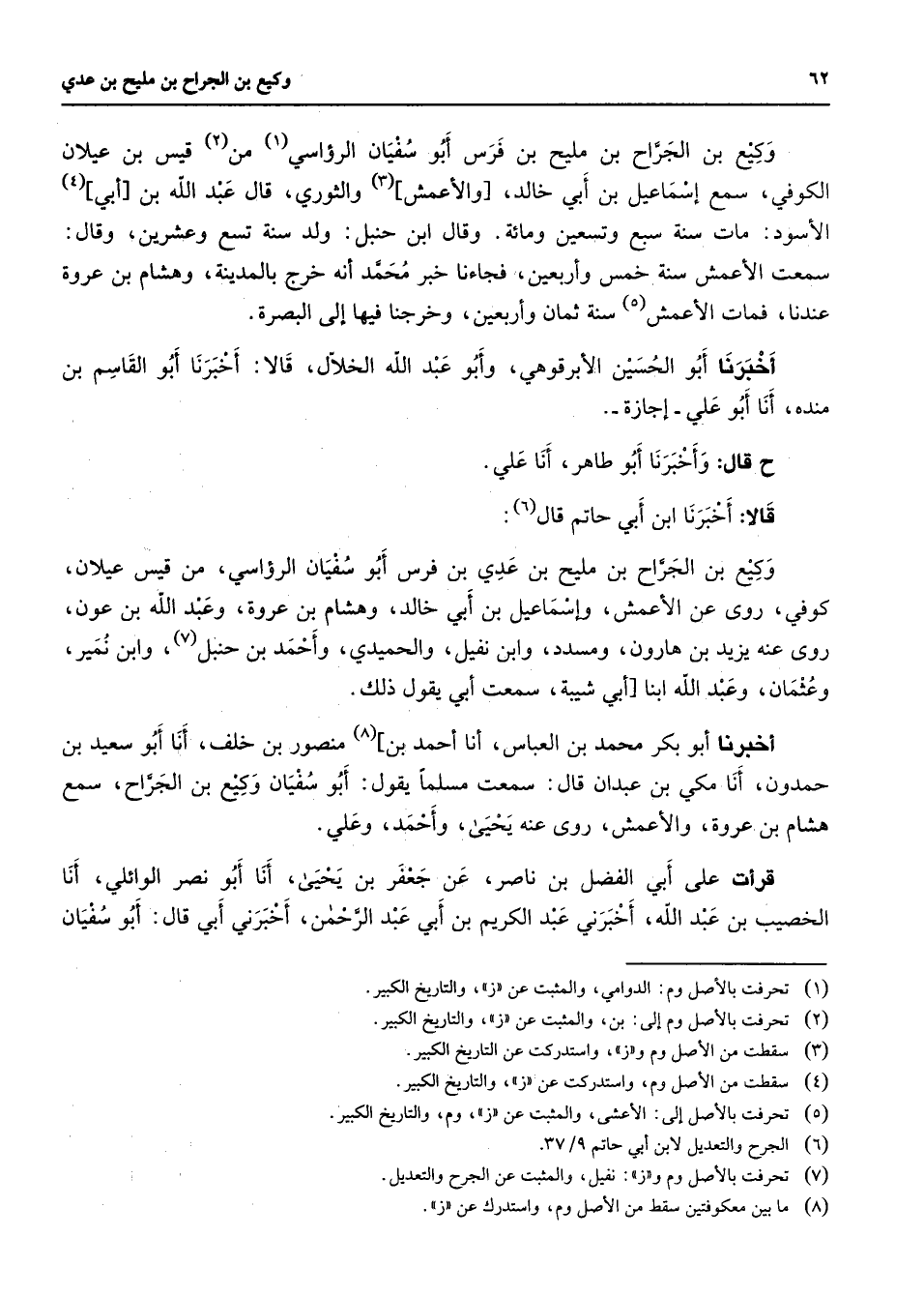 وكيع بن الجراح بن مليح بن فرس أبو سفيان الرؤاسي (1) من (2) قيس بن عيلان الكوفي سمع إسماعيل بن أبي خالد والأعمش (3) والثوري قال عبد الله بن أبي (4) الأسود مات سنة سبع وتسعين ومائة وقال ابن حنبل ولد سنة تسع وعشرين وقال سمعت الأعمش سنة خمس وأربعين فجاءنا خبر محمد أنه خرج بالمدينة وهشام بن عروة عندنا فمات الأعمش (5) سنة ثمان وأربعين وخرجنا فيها إلى البصرة أخبرنا أبو الحسين الأبرقوهي وابو عبد الله الخلال قالا أخبرنا أبو القاسم بن منده أنا أبو علي إجازة قال واخبرنا أبو طاهر أنا علي قالا أخبرنا ابن أبي حاتم قال (6) وكيع بن الجراح بن مليح بن عدي بن فرس أبو سفيان الرؤاسي من قيس عيلان كوفي روى عن الأعمش وإسماعيل بن أبي خالد وهشام بن عروة وعبد الله بن عون روى عنه يزيد بن هارون ومسدد وابن نفيل والحميدي واحمد بن حنبل (7) وابن نمير وعثمان وعبد الله ابنا أبي شيبة سمعت أبي يقول ذلك أخبرنا أبو بكر محمد بن العباس أنا أحمد بن (8) منصور بن خلف أنا أبو سعيد بن حمدون أنا مكي بن عبدان قال سمعت مسلما يقول أبو سفيان وكيع بن الجراح سمع هشام بن عروة والأعمش روى عنه يحيى واحمد وعلي قرات على أبي الفضل بن ناصر عن جعفر بن يحيى أنا أبو نصر الوائلي أنا الخصيب بن عبد الله أخبرني عبد الكريم بن أبي عبد الرحمن أخبرني أبي قال أبو سفيان