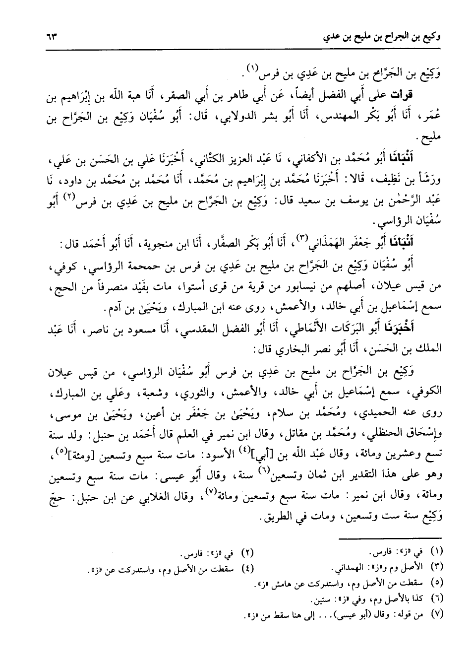 وكيع بن الجراح بن مليح بن عدي بن فرس (1) قرأت على أبي الفضل أيضا عن أبي طاهر بن أبي الصقر أنا هبة الله بن إبراهيم بن عمر أنا أبو بكر المهندس أنا أبو بشر الدولابي قال أبو سفيان وكيع بن الجراح بن مليح أنبأنا أبو محمد بن الأكفاني نا عبد العزيز الكتاني أخبرنا علي بن الحسن بن علي ورشأ بن نظيف قالا أخبرنا محمد بن إبراهيم بن محمد أنا محمد بن محمد بن داود نا عبد الرحمن بن يوسف بن سعيد قال وكيع بن الجراح بن مليح بن عدي بن فرس (2) أبو سفيان الرؤاسي أنبأنا أبو جعفر الهمذاني (3) أنا أبو بكر الصفار أنا ابن منجوية أنا أبو أحمد قال أبو سفيان وكيع بن الجراح بن مليح بن عدي بن فرس بن حمحمة الرؤاسي كوفي من قيس عيلان أصلهم من نيسابور من قرية من قرى أستوا مات بفيد منصرفا من الحج سمع إسماعيل بن أبي خالد والأعمش روى عنه ابن المبارك ويحيى بن آدم اخبرنا أبو البركات الأنماطي أنا أبو الفضل المقدسي انا مسعود بن ناصر أنا عبد الملك بن الحسن أنا أبو نصر البخاري قال وكيع بن الجراح بن مليح بن عدي بن فرس أبو سفيان الرؤاسي من قيس عيلان الكوفي سمع إسماعيل بن ابي خالد والاعمش والثوري وشعبة وعلي بن المبارك روى عنه الحميدي ومحمد بن سلام ويحيى بن جعفر بن أعين ويحيى بن موسى وإسحاق الحنظلي ومحمد بن مقاتل وقال ابن نمير في العلم قال أحمد بن حنبل ولد سنة تسع وعشرين ومائة وقال عبد الله بن ابي (4) الأسود مات سنة سبعة وتسعين ومئة (5) وهو على هذا التقدير ابن ثمان وتسعين (6) سنة وقال أبو عيسى مات سنة سبع وتسعين ومائة وقال ابن نمير مات سنة سبع وتسعين ومائة (7) وقال الغلابي عن ابن حنبل حج وكيع سنة ست وتسعين ومات في الطريق