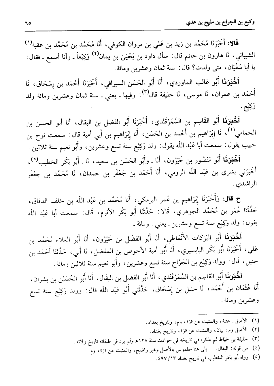قالا أخبرنا محمد بن زيد بن علي بن مروان الكوفي أنا محمد بن محمد بن عقبة (1) الشيباني نا هارون بن حاتم قال سأل داود بن يحيى بن يمان (2) وكيعا وأنا أسمع فقال يا أبا سفيان متى ولدت قال سنة ثمان وعشرين ومائة أخبرنا أبو غالب الماوردي أنا أبو الحسن السيرافي أخبرنا أحمد بن إسحاق نا أحمد بن عمران نا موسى نا خليفة قال (3) وفيها يعني سنة ثمان وعشرين ومائة ولد وكيع أخبرنا أبو القاسم بن السمرقندي أخبرنا أبو الفضل بن البقال أنا أبو الحسن بن الحمامي (4) نا إبراهيم بن أحمد بن الحسن أنا إبراهيم بن أبي أمية قال سمعت نوح بن حبيب يقول سمعت أبا عبد الله يقول ولد وكيع سنة تسع وعشرين وأبو نعيم سنة ثلاثين أخبرنا أبو منصور بن خيرون أنا أبو الحسن بن سعيد نا أبو بكر الخطيب (5) أخبرني بشرى بن عبد الله الرومي أنا أحمد بن جعفر بن حمدان نا محمد بن جعفر الراشدي ح قال وأخبرنا إبراهيم بن عمر البرمكي أنا محمد بن عبد الله بن خلف الدقاق حدثنا عمر بن محمد الجوهري قالا جدثنا أبو بكر الأثرم قال سمعت أبا عبد الله يقول ولد وكيع سنة تسع وعشرين يعني ومائة أخبرنا أبو البركات الأنماطي أنا أبو الفضل بن خيرون أنا أبو العلاء محمد بن علي أخبرنا أبو بكر البابسيري أنا أبو أمية الأحوص بن المفضل نا أبي حدثنا أحمد بن حنبل قال وولد وكيع بن الجراح سنة تسع وعشرين وأبو نعيم سنة ثلاثين ومائة أخبرنا أبو القاسم بن السمرقندي أنا أبو الفضل بن البقال أنا أبو الحسين بن بشران أنا عثمان بن أحمد نا حنبل بن إسحاق حدثني أبو عبد الله قال وولد وكيع سنة تسع وعشرين ومائة