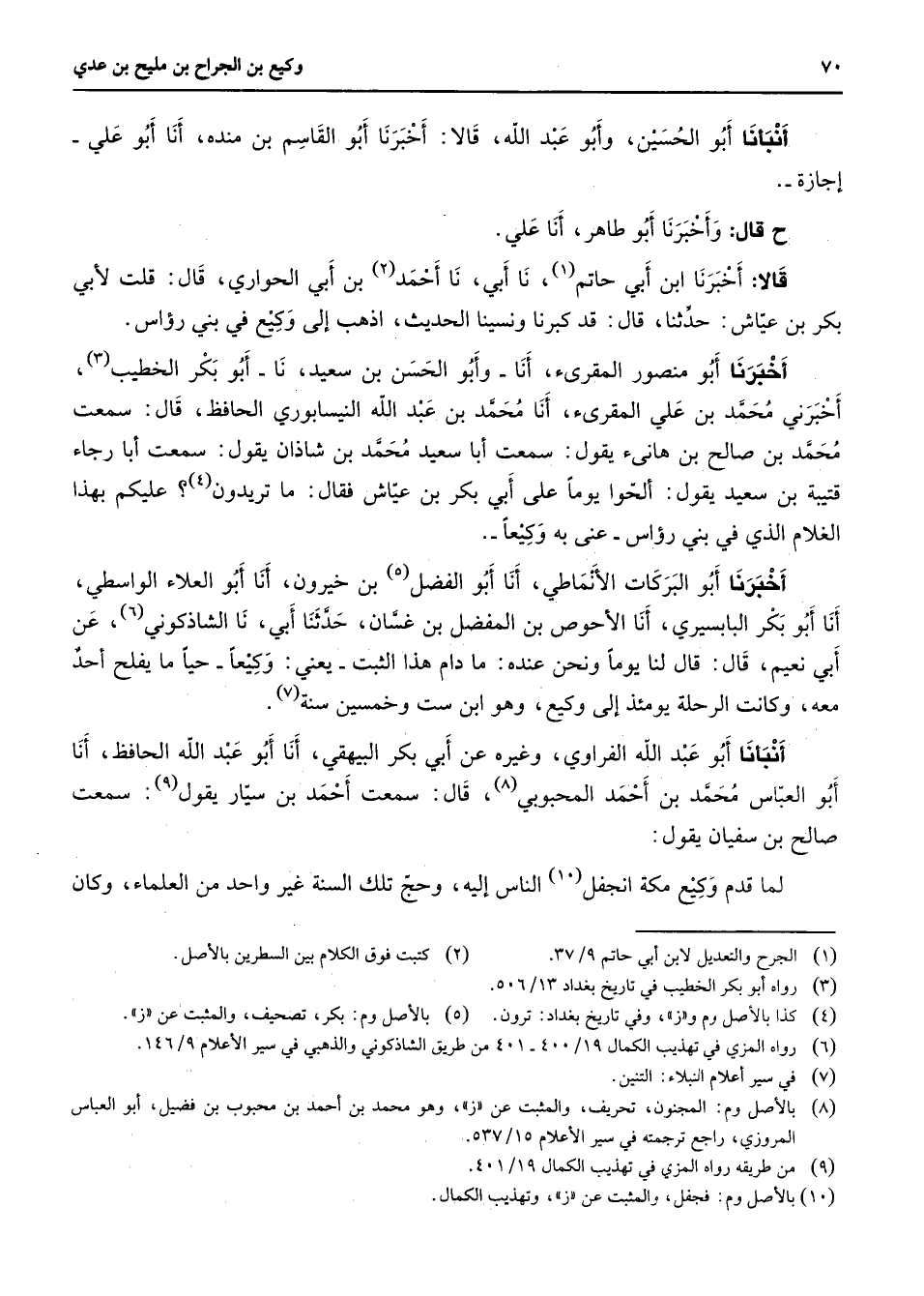 أنبأنا أبو الحسين وأبو عبد الله قالا أخبرنا أبو القاسم بن منده أنا أبو علي إجازة ح قال وأخبرنا أبو طاهر أنا علي قالا أخبرنا ابن أبي حاتم (1) نا أبي نا أحمد (2) بن أبي الحواري قال قلت لأبي بكربن عياش حدثنا قال قد كبرنا ونسينا الحديث اذهب إلى وكيع في بني رؤاس أخبرنا أبو منصور المقرئ أنا وأبو الحسن بن سعيد نا أبو بكر الخطيب (3) أخبرني محمد بن علي المقرئ أنا محمد بن عبد الله النيسابوري الحافظ قال سمعت محمد بن صالح بن هانئ يقول سمعت أبا سعيد محمد بن شاذان يقول سمعت أبا رجاء قتيبة بن سعيد يقول ألحوا يوما على أبي بكر بن عياش فقال ما تريدون (4) عليكم بهذا الغلام الذي في بني رؤاس عني به وكيعا أخبرنا أبو البركات الأنماطي أنا أبو الفضل (5) بن خيرون أنا أبو العلاء الواسطي أنا أبو بكر البابسيري أنا الأحوص بن المفضل بن غسان خدثنا أبي نا الشاذكوني (6) عن أبي نعيم قال قال لنا يوما ونحن عنده ما دام هذا الثبت يعني وكيعا حيا ما يفلح أحد معه وكانت الرحلة بومئذ إلى وكيع وهو ابن ست وخمسين سنة (7) أنبأنا أبو عبد الله الفراوي وغيره عن أبي بكر البيهقي أنا أبو عبد الله الحافظ أنا أبو العباس محمد بن أحمد المحبوبي (8) قال سمعت أحمد بن سيار يقول (9) سمعت صالح بن سفيان يقول لما قدم وكيع مكة انجفل (10) الناس إليه وحج تلك السنة غير واحد من العلماء وكان