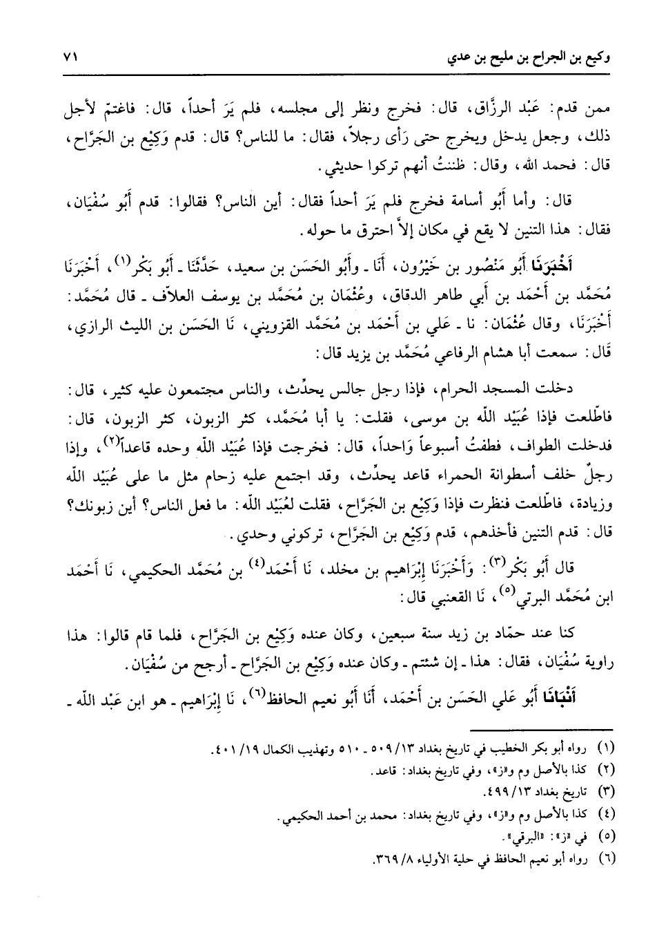 ممن قدم عبد الرزاق قال فخرج ونظر إلى مجلسه فلم ير أحدا قال فاغتنم لأجل ذلك وجعل يدخل ويخرج حتى أرى رجلا فقال ما للناس قال قدم وكيع بن الجراح قال فحمد الله وقال ظننت أنهم تركوا حديثي قال وأما أبو أسامة فخرج فلم ير أحدا فقال أين الناس فقالوا قدم أبو سفيان فقال هذا التنين لا يقع في مكان إلا احترق ما حوله أخبرنا أبو منصور بن خيرون أنا وابو الحسن بن سعيد حدثنا أبو بكر (1) أخبرنا محمد بن أحمد بن أبي طاهر الدقاق وعثمان بن محمد بن يوسف العلاف قال محمد أخبرنا وقال عثمان نا علي بن أحمد بن محمد القزويني نا الحسن بن الليث الرازي قال سمعت أبا هشام الرفاعي محمد بن يزيد قال دخلت المسجد الحرام فإذا رجل جالس يحدث والناس مجتمعون عليه كثير قال فأطلعت فإذا عبيد الله بن موسى فقلت يا أبا محمد كثر الزبون كثر الزبون قال فدخلت الطواف فطفت أسبوعا واحدا قال فخرجت فإذا عبيد الله وحده قاعدا (2) وإذا رجل خلف أسطوانة الحمراء قاعد يحدث وقد اجتمع عليه زحام مثل ما على عبيد الله وزيادة فاطلعت فنظرت فإذا وكيع بن الجراح فقلت لعبيد الله ما فعل الناس أين زبونك قال قدم التنين فأخذهم قدم وكيع بن الجراح تركو ني وحدي قال أبو بكر (3) وأخبرنا إبراهيم بن مخلد نا أحمد (4) بن محمد الحكيمي نا أحمد ابن محمد البرتي (5) نا القعنبي قال كنا عند حماد بن زيد سنة سبعين وكان عنده وكيع بن الجراح فلما قام قالوا هذا رواية سفيان فقال هذا إن شئتم وكان عنده وكيع بن الجراح أرجح من سفيان انبأنا أبو علي الحسن بن أحمد أنا أبو نعيم الحافظ (6) نا إبراهيم هو ابن عبد الله