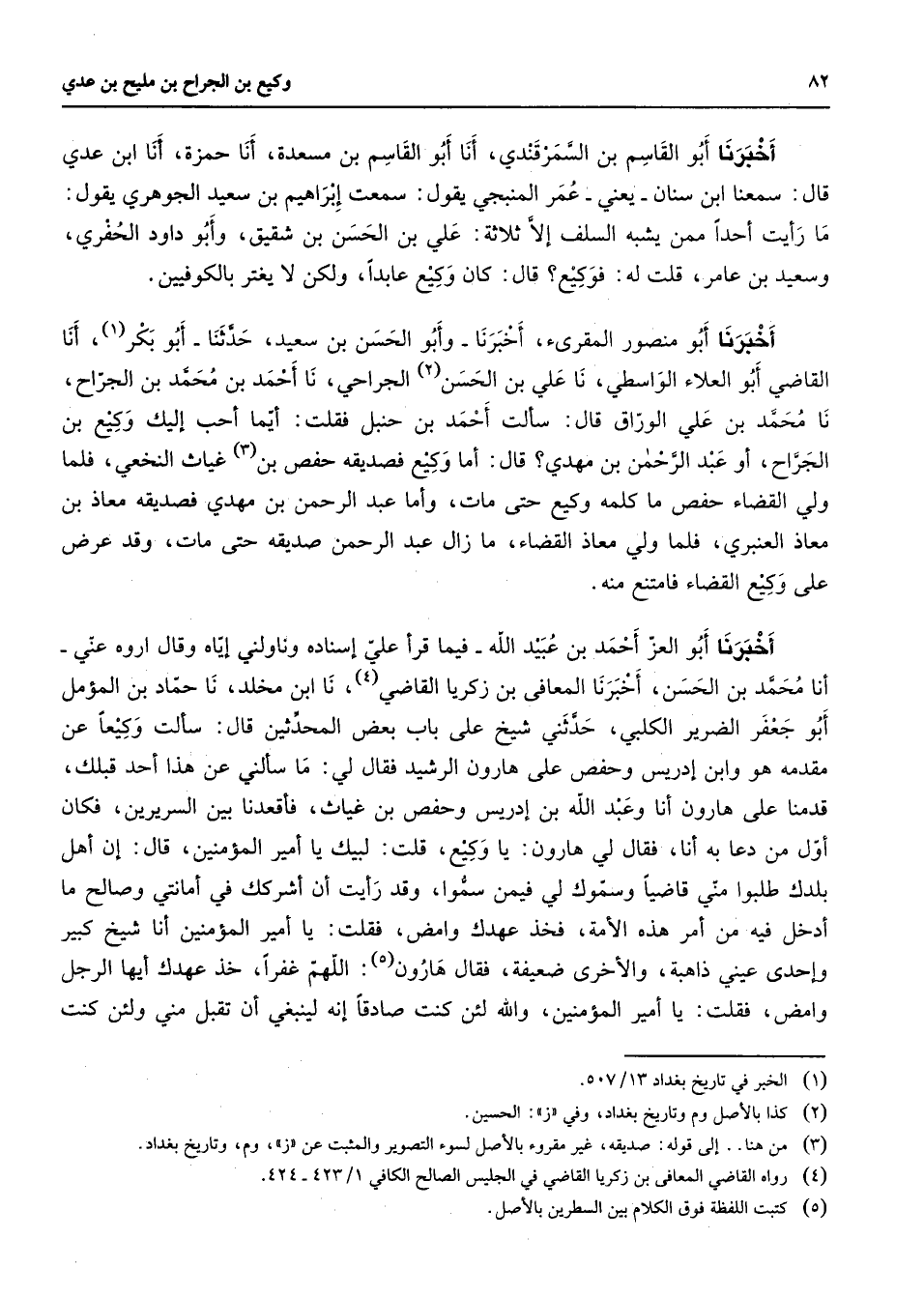 أخبرنا أبو القاسم بن السمرقندي أنا أبو القاسم بن مسعدة أنا حمزة أنا ابن عدي قال سمعنا ابن سنان يعني عمر المنبجي يقول سمعت إبراهيم بن سعيد الجوهري يقول ما رأيت أحدا ممن يشبه السلف إلا ثلاثة علي بن الحسن بن شقيق وأبو داود الحفري وسعيد بن عامر قالت له فوكيع قال كان وكيع عابدا ولكن لا يغتر بالكوفيين أخبرنا أبو منصور المقرئ أخبرنا وأبو الحسن بن سعيد حدثنا أبو بكر (1) أن القاضي أبو العلاء الواسطي نا علي بن الحسن (2) الجراحي نا أحمد بن محمد بن الجراح نا نا محمد بن علي الوراق قال سألت أحمد بن حنبل فقلت أيما أحب إليك وكيع بن الجراح أو عبد الرحمن بن مهدي قال أما وكيع فصديقه حفص بن (3) غياث النخعي فلما ولي القضاء حفص ما كلمه وكيع حتى مات واما عبد الرحمن بن مهدي فصديقه معاذ بن معاذ الحنبري فلما ولي معاذ القضاء ما زال عبد الرحمن صديقه حتى مات وقد عرض على وكيع القضاء فامتنع عنه أخبرنا أبو العز أحمد بن عبيد الله فيما قرأ علي إسناده وناولني إياه وقال اروه عني أنا محمد بن الحسن أخبرنا المعافى بن زكريا القاضي (4) نا ابن مخلد نا حماد بن المؤمل أبو جعفر الضرير الكلبي حدثني شيخ على باب بعض المحدثين قال سألت وكيعا عن مقدمه هو وابن إدريس وحفص على هارون الرشيد فقال لي ما سألني عن هذا أحد قبلك قدمنا على هارون أنا وأبو عبد الله بن إدريس وحفص بن غياث فأقعدنا بين السريرين فكان أول ما دعا به أنا فقال لي هارون يا وكيع قلت لبيك يا أمير المؤمنين قال إن أهل بلدك طلبوا مني قاضيا وسموك لي فيمن سموا وقد رأيت أن أشركك في أمانتي وصالح ما أدخل فيه من أمر هذه الأمة فخذ عهدك وامض فقلت يا أمير المؤمنين أنا شيخ كبير وإحدى عيني ذاهبة والأخرى ضعيفة فقال هارون (5) اللهم غفرا خذ عهدك أيها الرجل وامض فقلت يا أمير المؤمنين والله لئن كنت صادقا إنه لينبغي أن تقبل مني ولئن كنت
