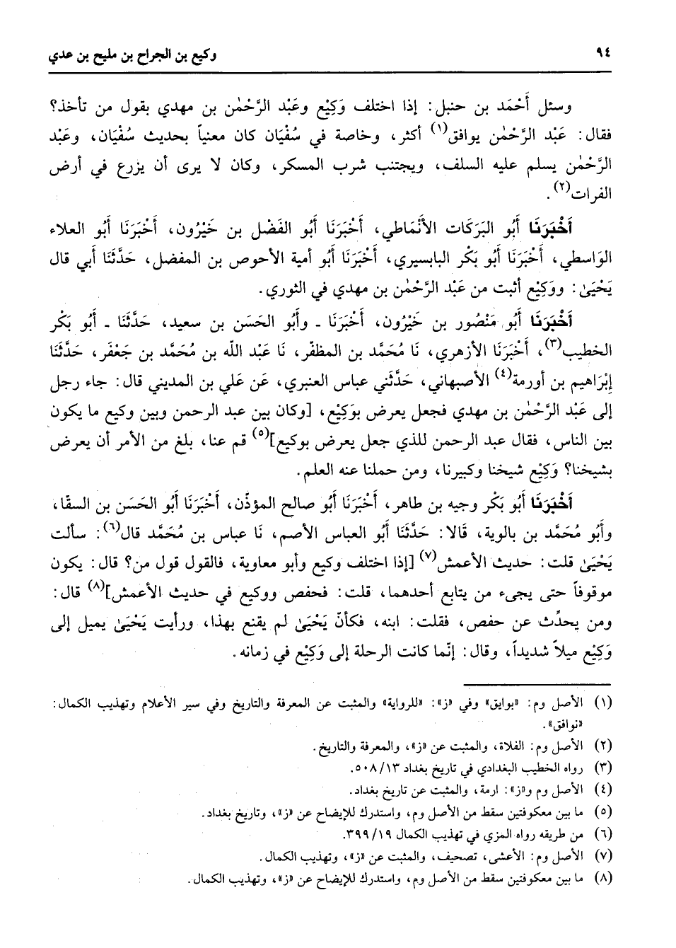 وسئل أحمد بن حنبل إذا اختلف وكيع وعبد الرحمن بن مهدي بقول من تأخذ فقال عبد الرحمن يوافق (1) أكثر وخاصة في سفيان كان معينا بحديث سفيان وعبد الرحمن يسلم عليه السلف ويجتنب شرب المسكر وكان لا يرى أن يزرع في أرض الفرات (2) أخبرنا أبو البركات الأنماطي أخبرنا أبو الفضل بن خيرون أخبرنا أبو العلاء الواسطي أخبرنا أبو بكر البابسيري أخبرنا أبو أمية الأحوص بن المفضل حدثنا أبي قال يحيى ووكيع أثبت من عبد الرحمن بن مهدي في الثوري أخبرنا أبو منصور بن خيرون أخبرنا وأبو الحسن بن سعيد حدثنا أبو بكر الخطيب (3) أخبرنا الأزهري نا محمد بن المظفر نا عبد الله بن ومحمد بن جعفر حدثنا إبراهيم بن أورمة (4) الأصبهاني حدثني عباس العنبري عن علي بن المديني قال جاء رجل إلى عبد الرحمن بن مهدي فجعل يعرض بوكيع وكان بين عبد الرحمن وبين وكيع ما يكون بين الناس فقال عبد الرحمن للذي جعل يعرض بوكيع (5) قم عنا بلغ من الأمر أن يعرض بشيخنا وكيع شيخنا وكبيرنا ومن حملنا عنه العلم أخبرنا أبو بكر وجيه بن طاهر أخبرنا أبو صالح المؤذن أخبرنا أبو الحسن بن السقا وأبو محمد بن بالويه قالا حدثنا أبو العباس الأصم نا عباس بن محمد قال (6) سألت يحيى قلت حديث الأعمش (7) إذا اختلف وكيع وأبو معاوية فالقول قول من قال يكون موقوفا حتى يجئ من يتابع أحدهما قلت فحفص ووكيع في حديث الأعمش (8) قال ومن يحدث عن حفص فقلت إبنه فكأن يحيى لم يقنع بهذا ورأيت يحيى يميل إلى وكيع ميلا شديدا وقال إنما كانت الرحلة إلى وكيع في زمانه